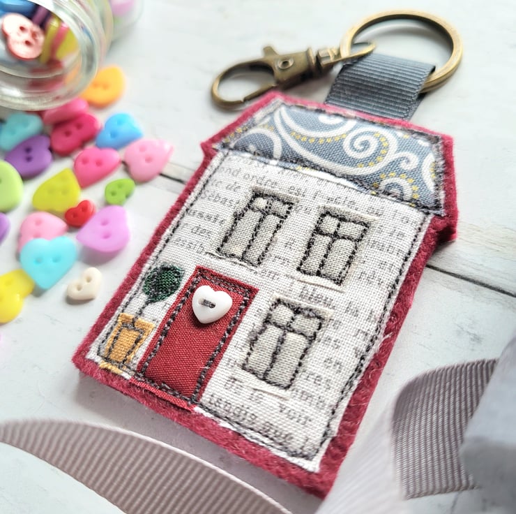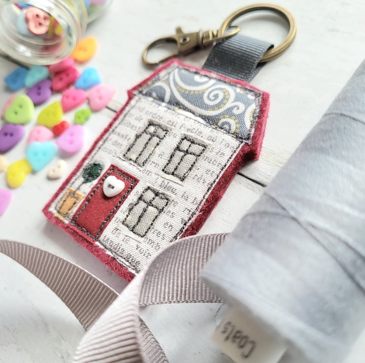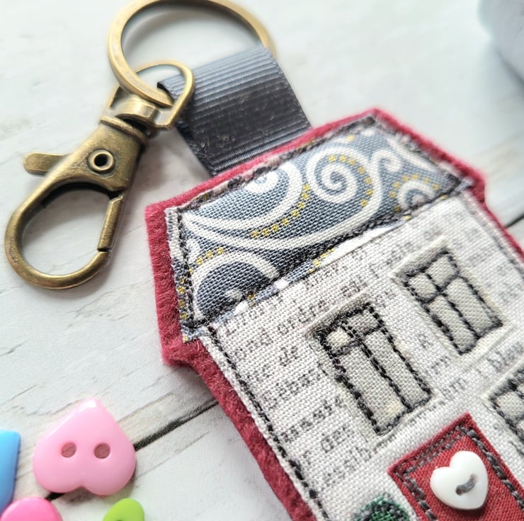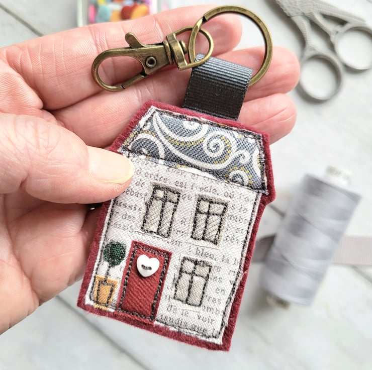 Beautiful little house keyring with freemotion sewn appliqued fabrics.
