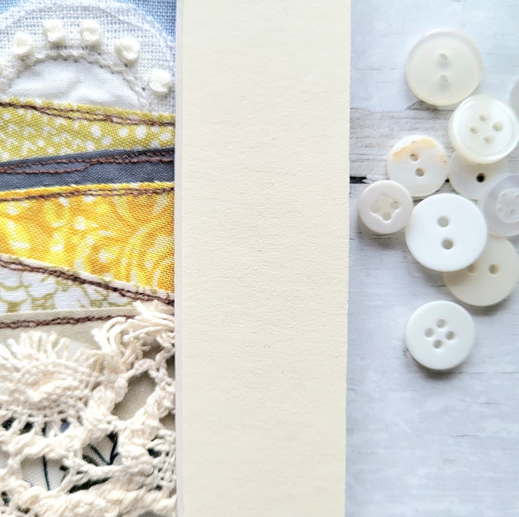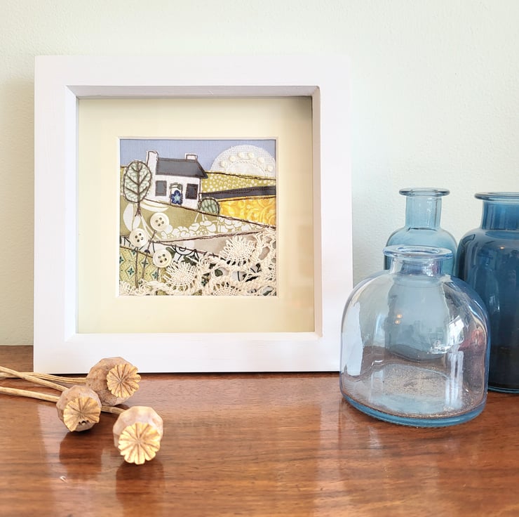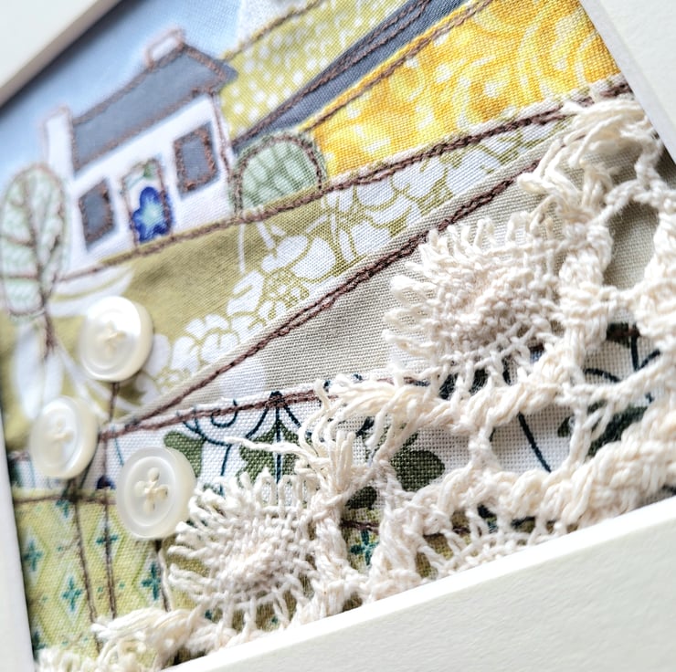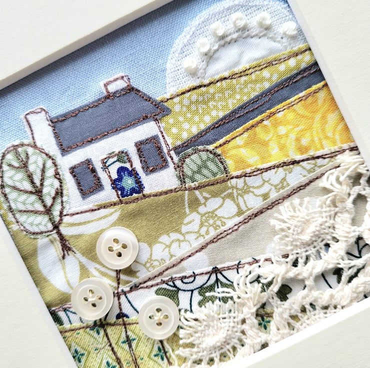 This framed textile piece depicts a rural landscape, with a white cottage sitting on a hill, overlooking rolling fields. It has been created using a variety of freemotion sewn fabrics, including lace. And is finished with tiny buttons.