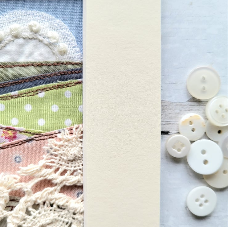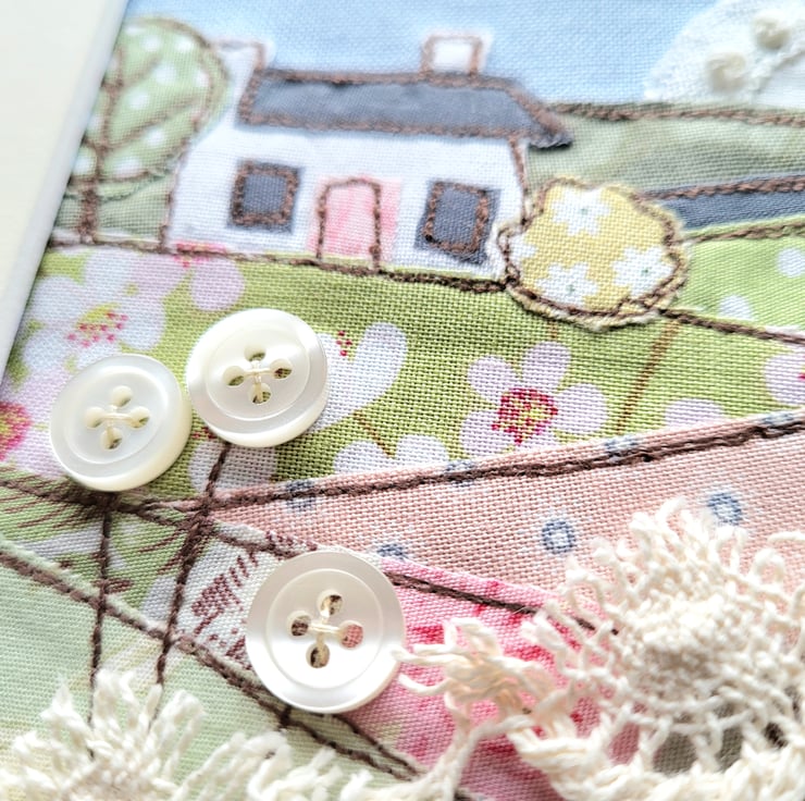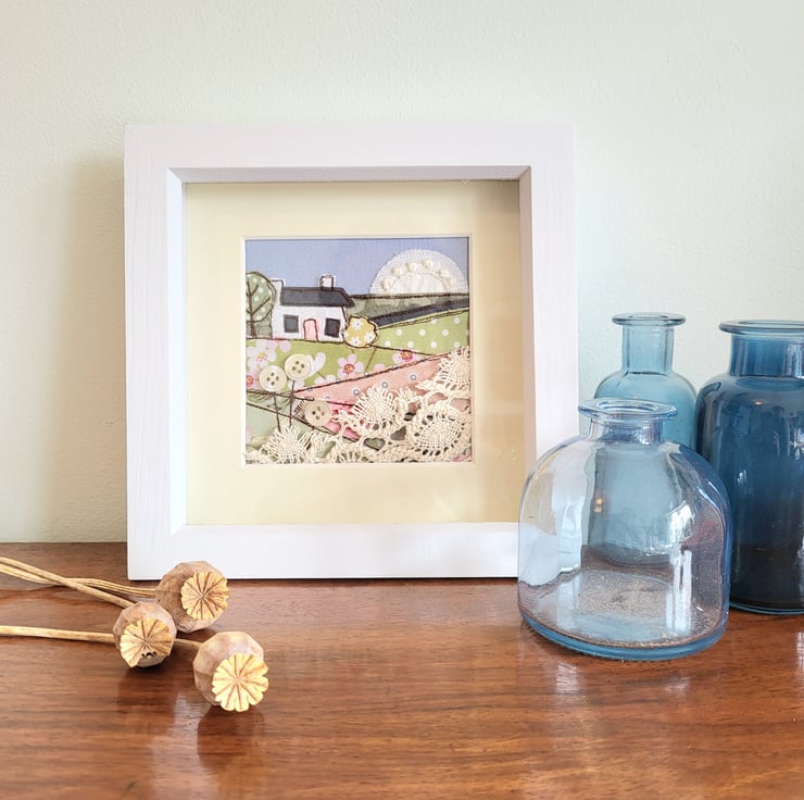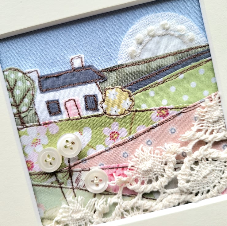 This framed textile piece depicts a rural landscape, with a white cottage sitting on a hill, overlooking rolling fields. It has been created using a variety of freemotion sewn fabrics, including lace. And is finished with tiny buttons.