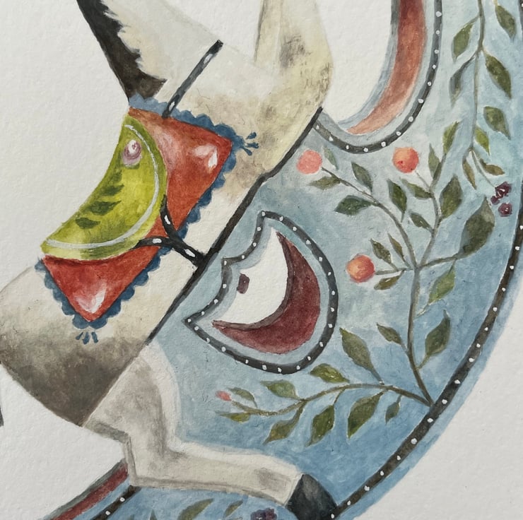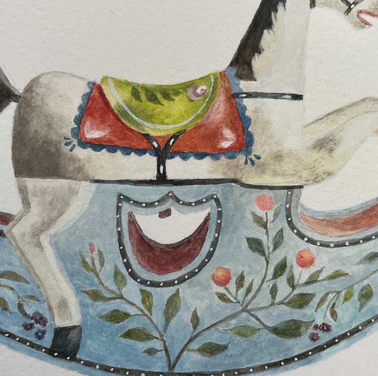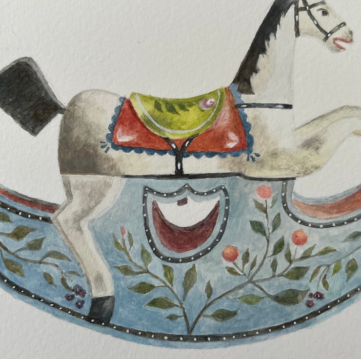 An original painting of an old rocking horse. The painting was made with professional gouache paints onto 300gsm acid free watercolour paper. The paper measures 18cm by 12.5cm and the image measures 12.5cm by 9cm and would make an ideal gift for someone. The painting will be sent in a board back envelope.
