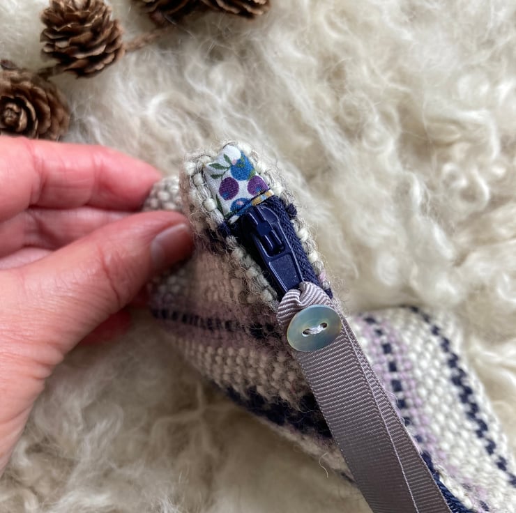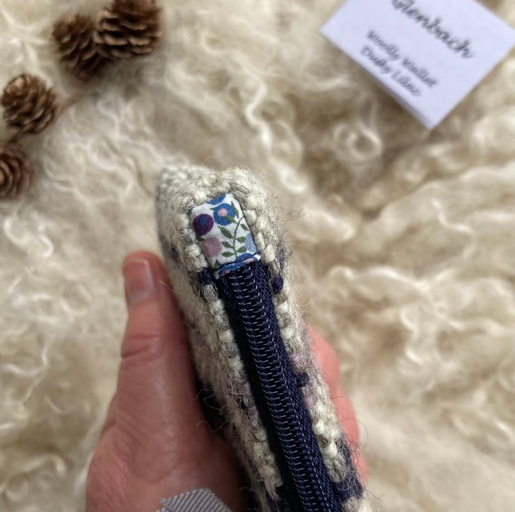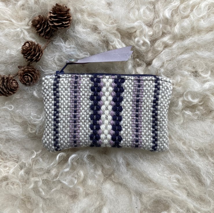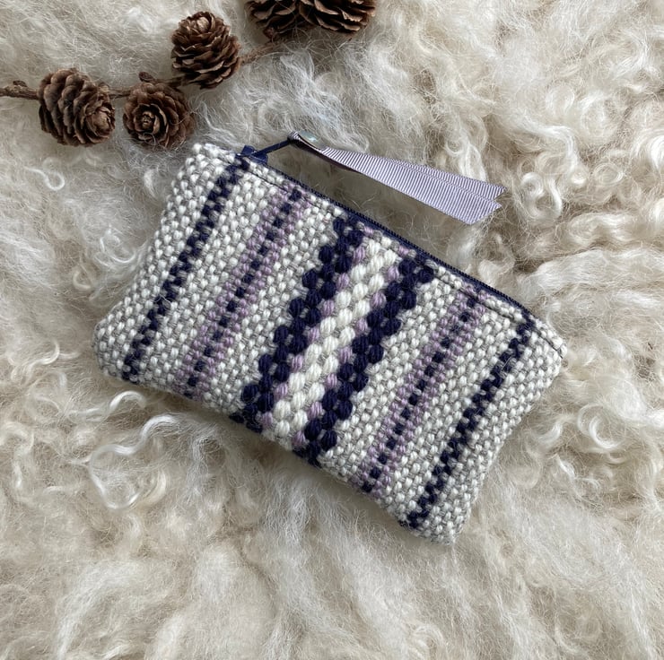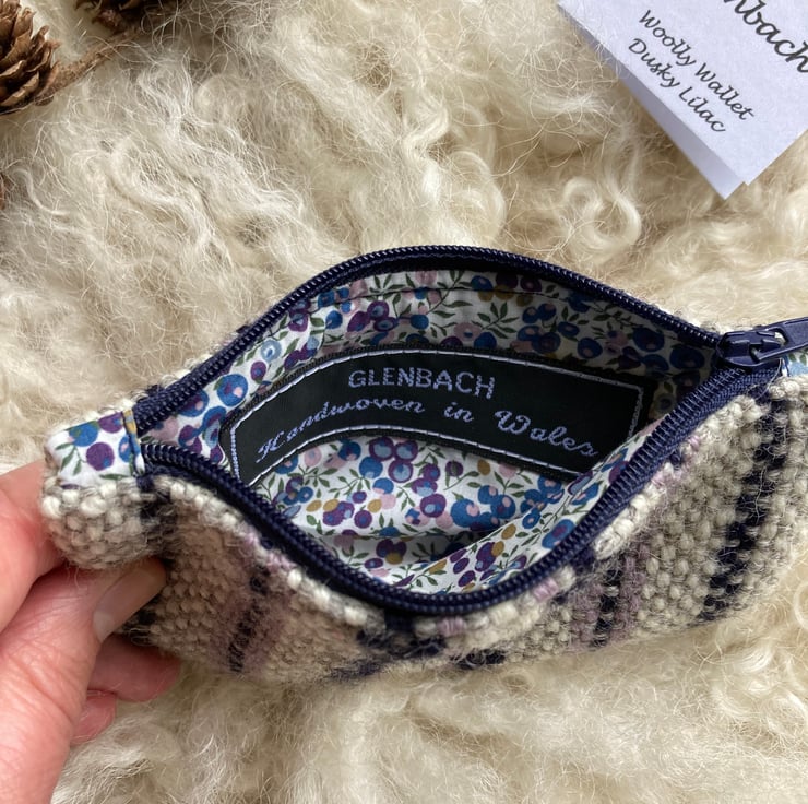 Our Woolly Wallet is handwoven using natural shades of grey and ecru wool with a contrast of dusky lilac and navy blue - all British wool.