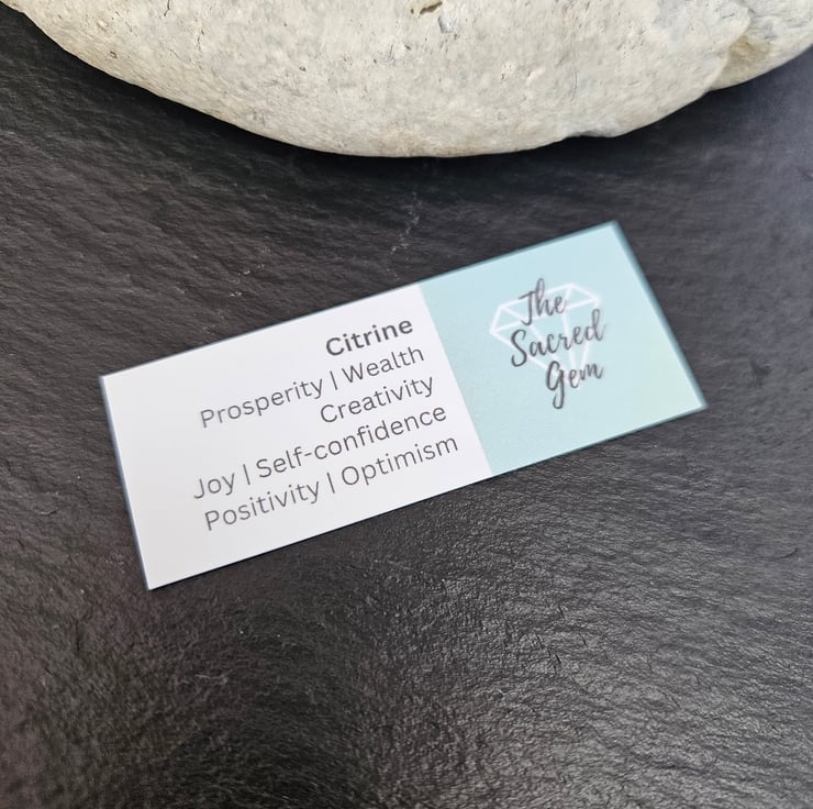 The bracelet comes carefully packaged in a card gift box which is 100% recyclable. Underneath the box insert, you will find a small poly bag for storage and an anti-tarnish strip to help keep the silver shiny. A gemstone card is also provided, which highlights the main properties or meanings associated with citrine. On the reverse side of the card are some simple jewellery care guidelines.