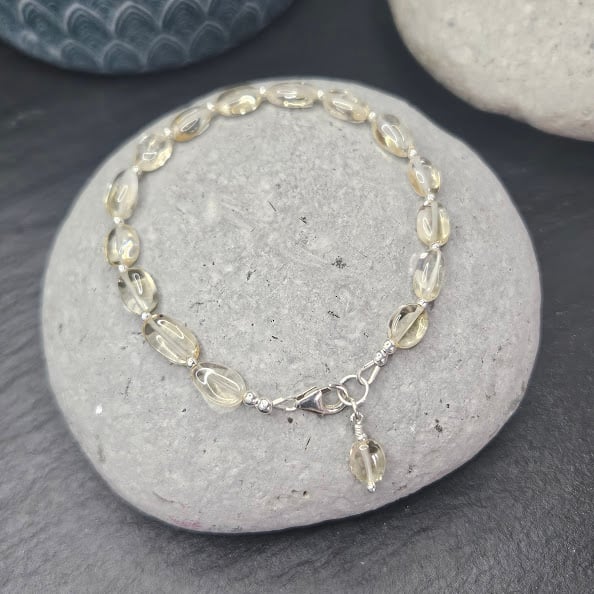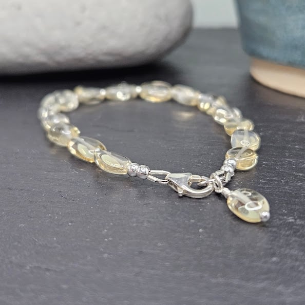 This pretty bracelet is made with cloudy citrine gemstones interspaced with round sterling silver beads. The bracelet fastens with a sterling silver carabiner clasp and is threaded on strong and flexible 49-strand jewellery wire. All the metal components of the bracelet are sterling silver.