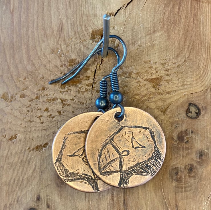 All pieces are lovingly and individually handmade; earrings are hand-cut and designs are individually scribed freehand before being acid etched and patinated - as such there may be slight differences from the listing photograph.