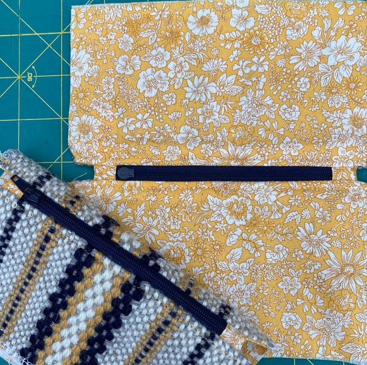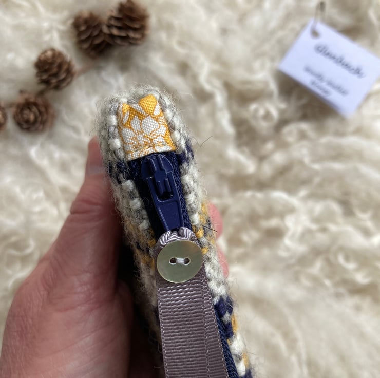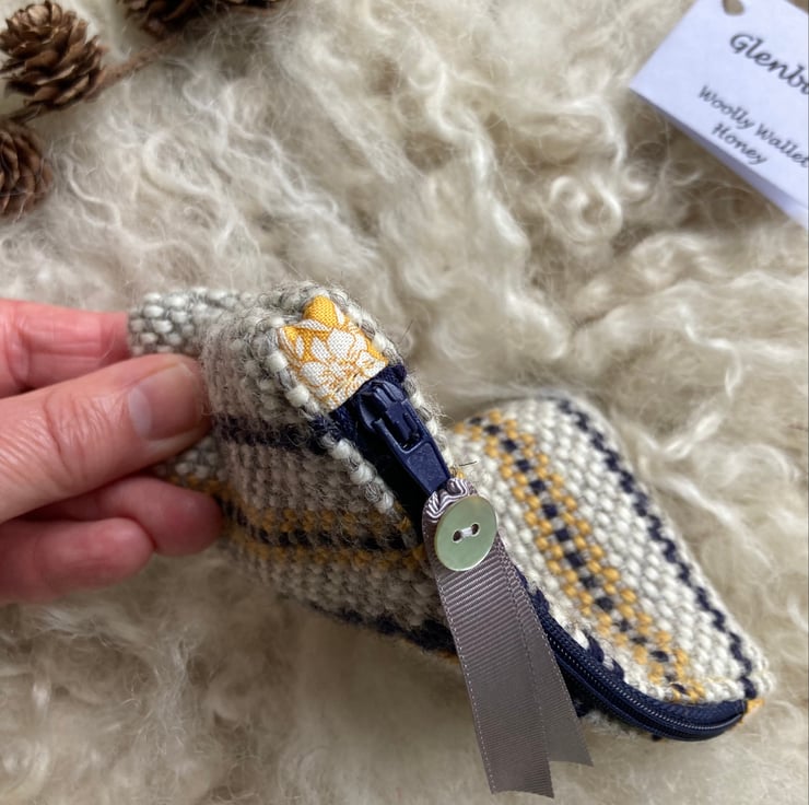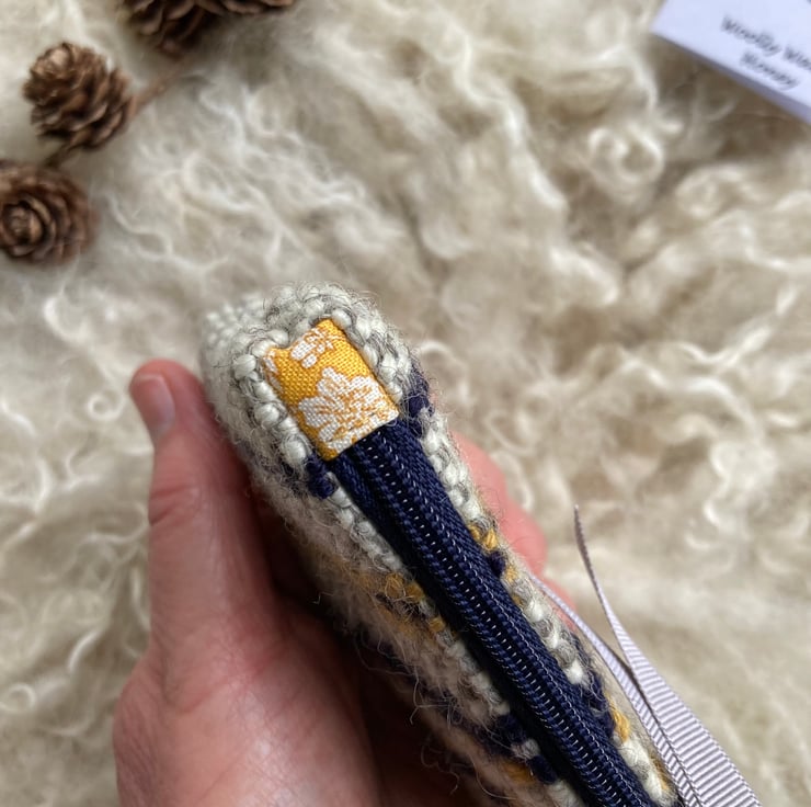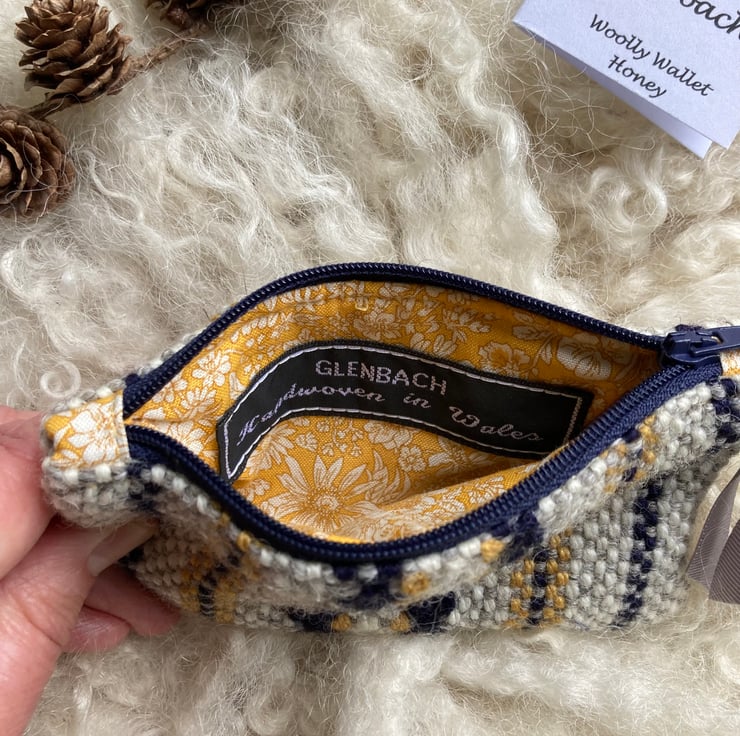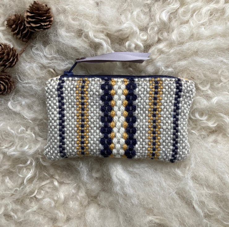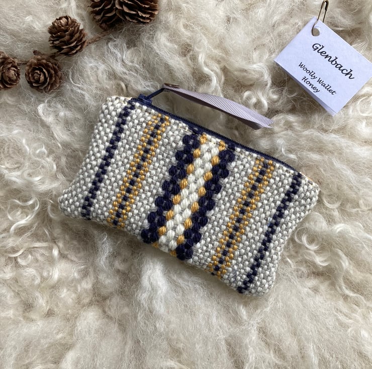 Our Woolly Wallet is handwoven using natural shades of grey and ecru wool with a contrast of honey and navy blue - all British wool.