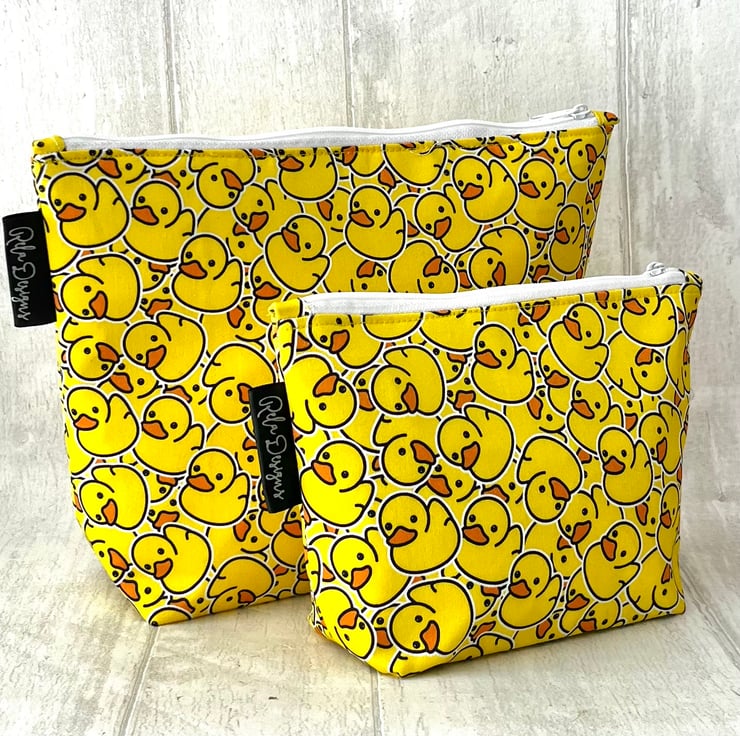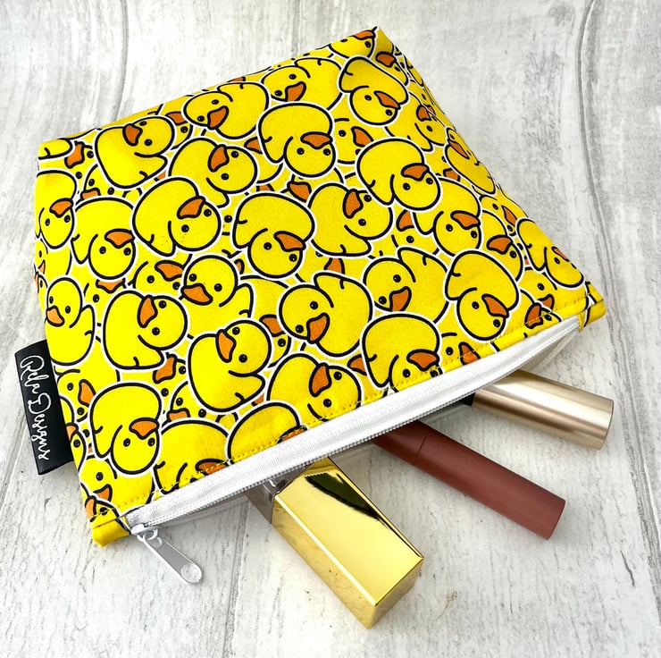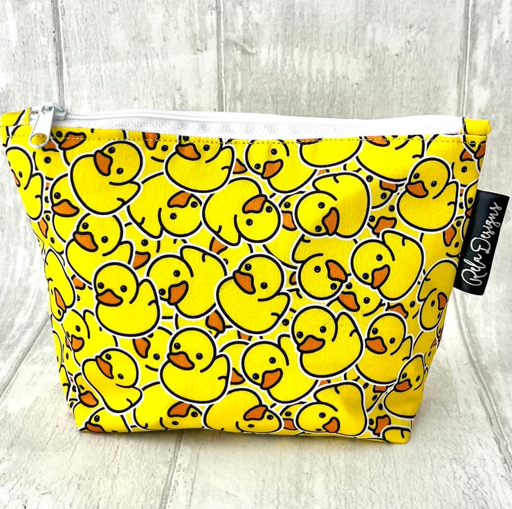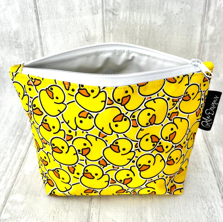 This cute bath time duck print cotton zipped pouch has a white waterproof nylon lining , great for those inevitable spills.