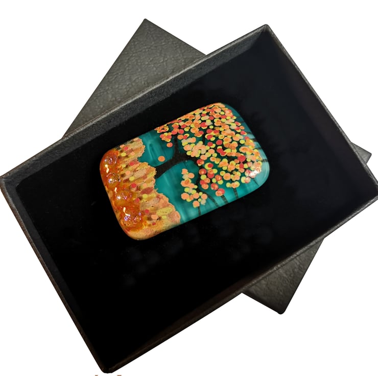 Carefully made by sandwiching a background layer of wispy blue bullseye glass with a cover of transparent glass. The tree and ground were hand painted using glassline on the blue background glass. The Autumn foliage and sparkling foreground were then layered onto the transparent layer of glass. Once fused in my kiln these different layers give the brooch a three-dimensional appearance.