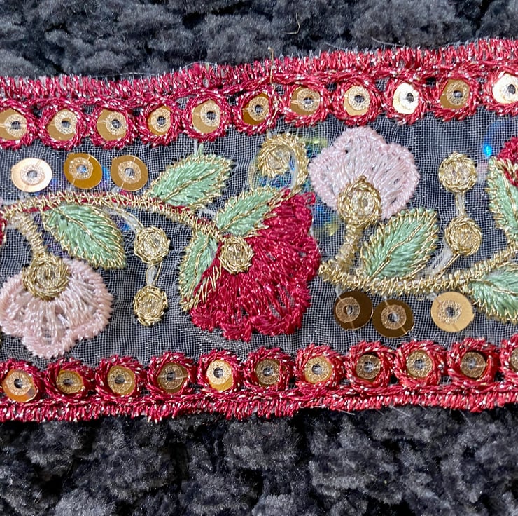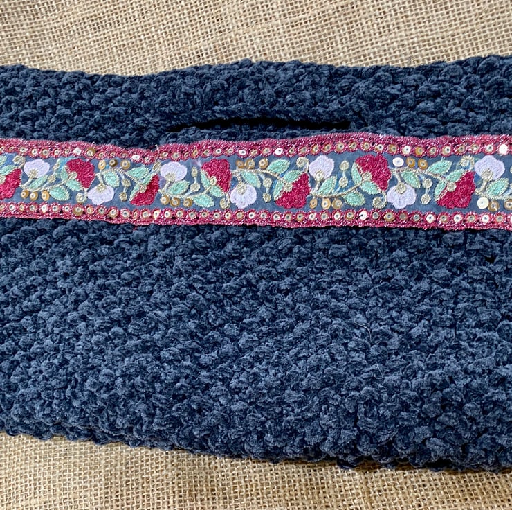 This is a hand-knitted grey-green chenille evening bag embellished with a beautiful embroidered and sequin ribbon with pink and red flowers.. It measures 35 x 27 cm approximately. It is posted via Royal Mail 2nd class small parcel post.