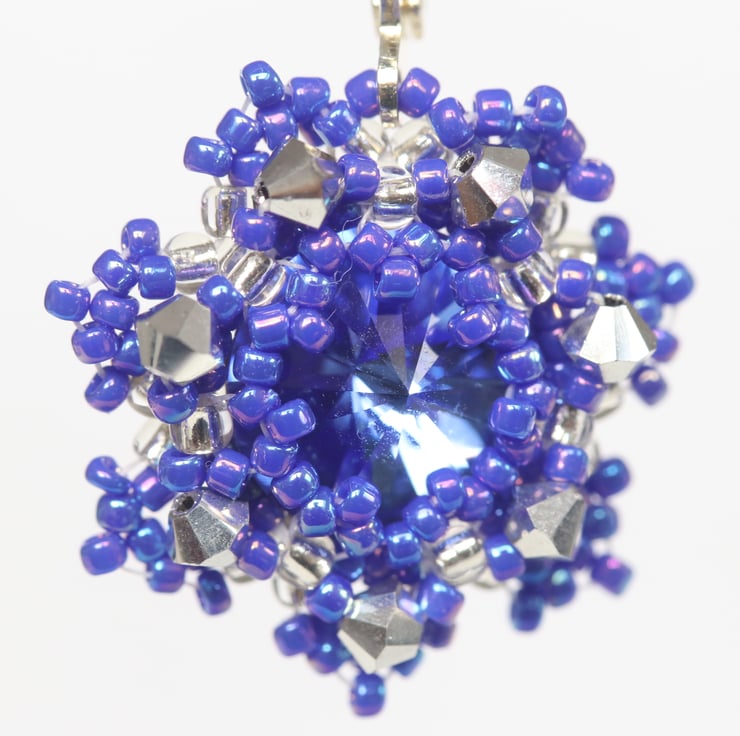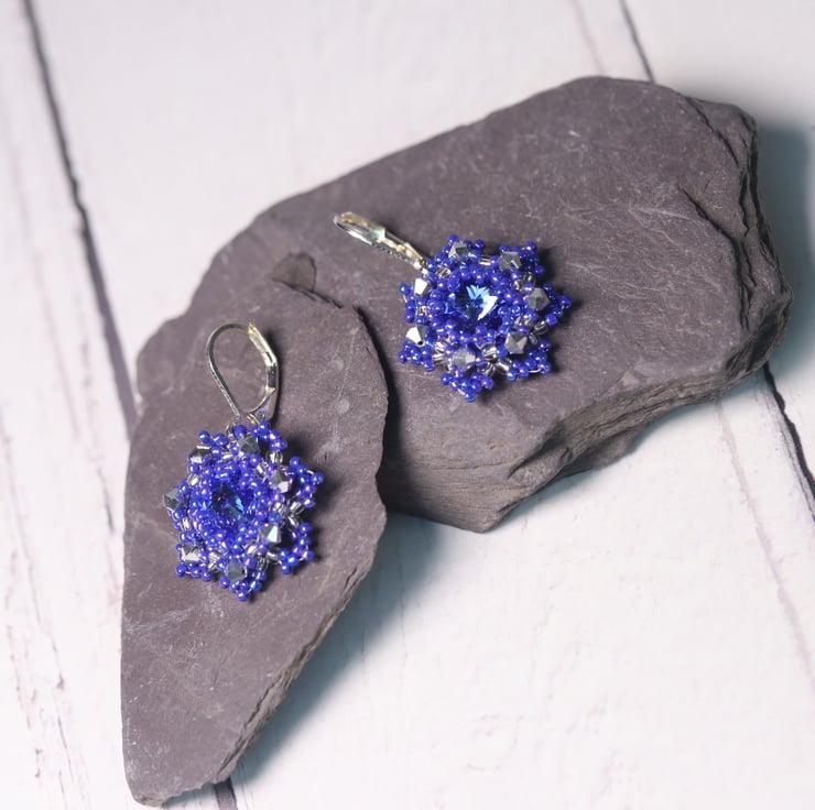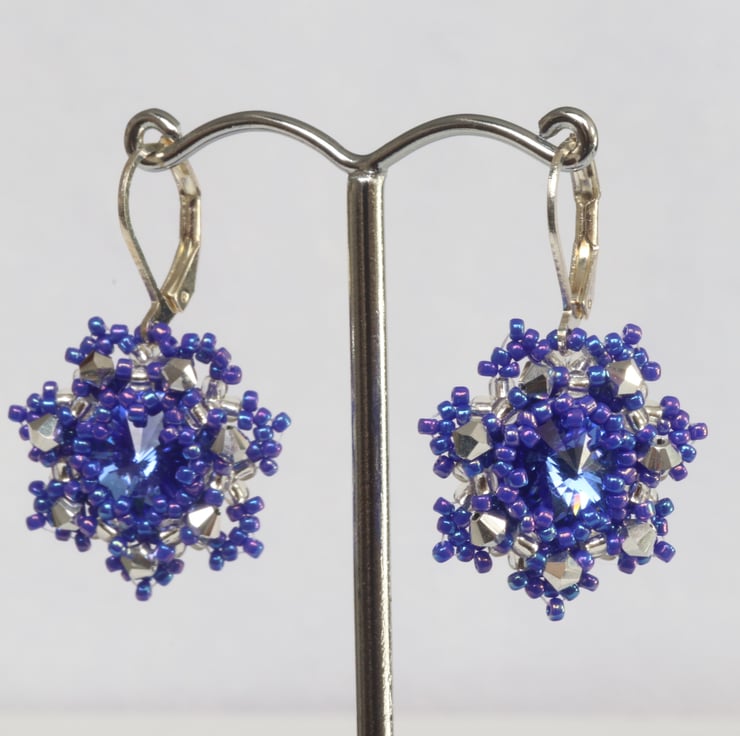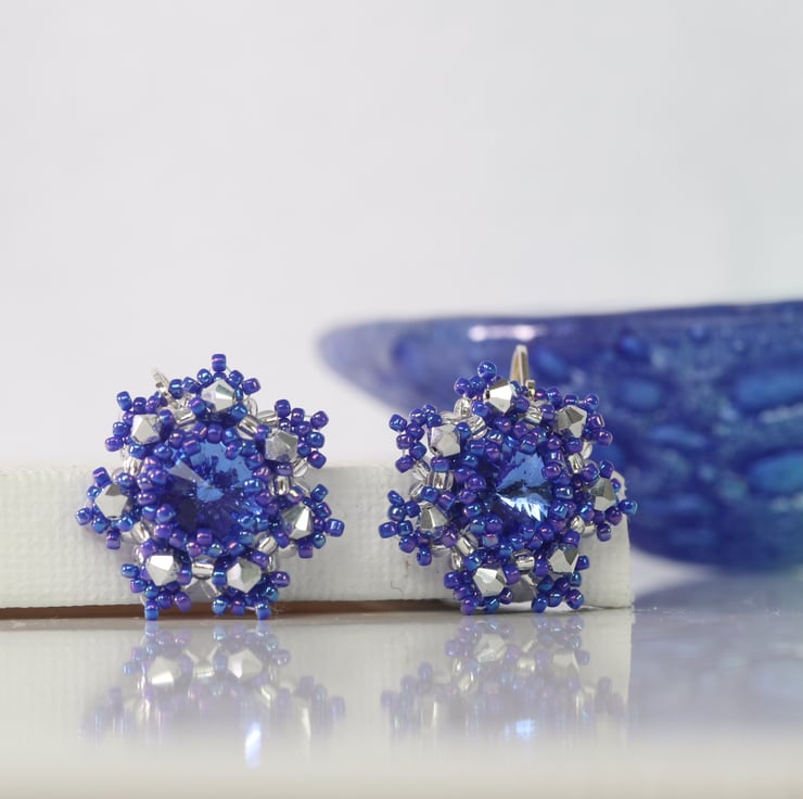 These dainty little earrings are made from tiny electric blue seed beads with purple overtones, stitched around a toning blue Rivoli crystal and pretty silver coloured bicone crystals.