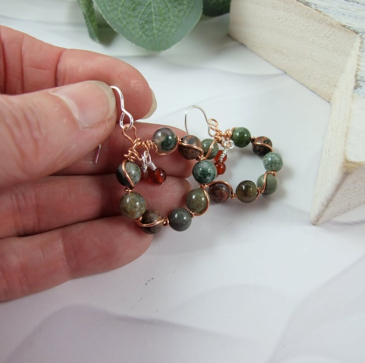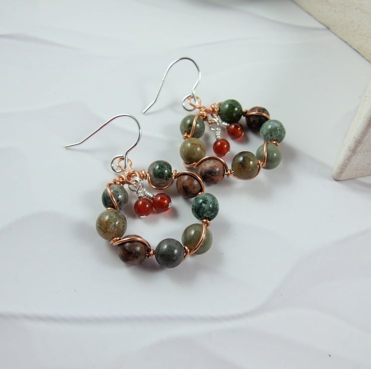 I began by creating the wreath with copper wire wrapped around 6mm moss agate beads into a circle. At the centre I have added two small carnelian beads wire wrapped in sterling silver wire and finished with sterling silver ear wires.