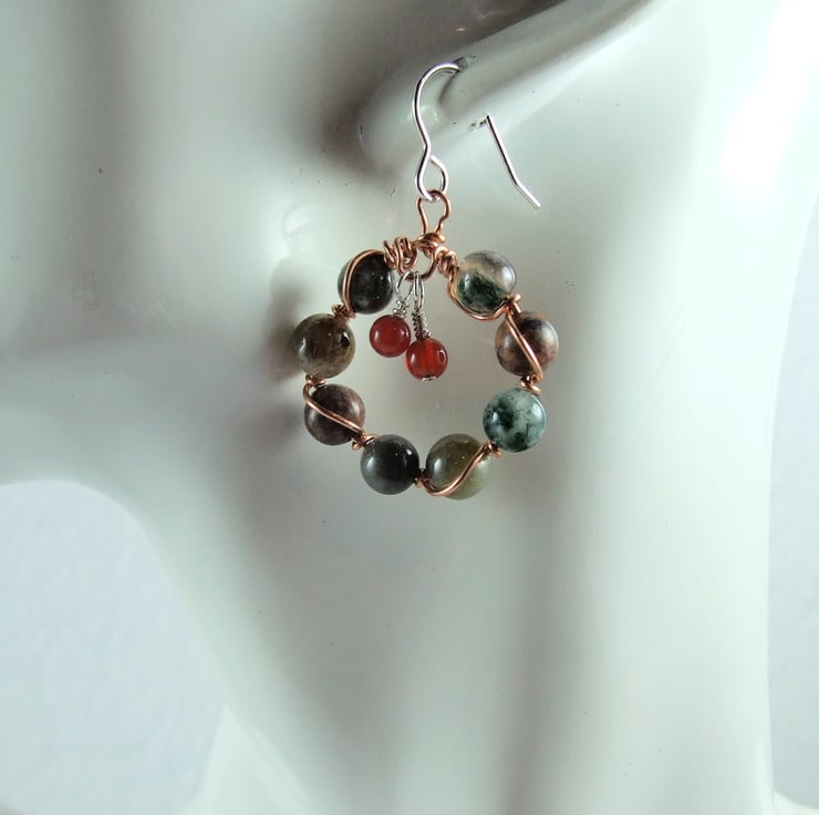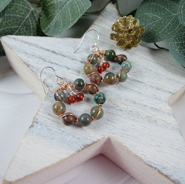 Christmas Wreath Earrings. Moss agate and copper wire with carnelian berries and Sterling Silver ear wires.