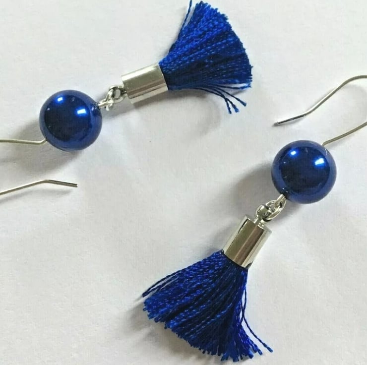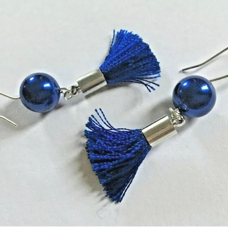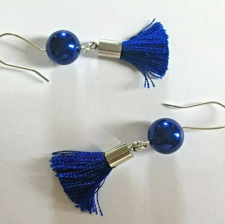Each Earring has one Royal Blue Shell Pearl, and a Cobalt Blue Tassel.