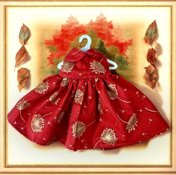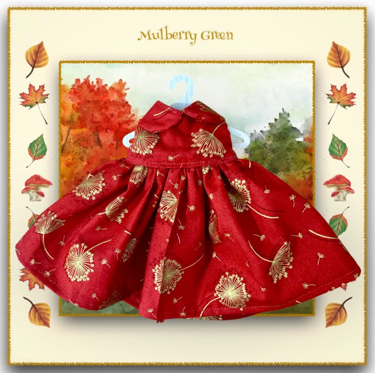 A really beautiful dress in burnt orange with a gold dandelion clocks print, to fit the Mulberry Green characters. The dress is made from best quality cotton and has a lined bodice and Peter Pan collar.
