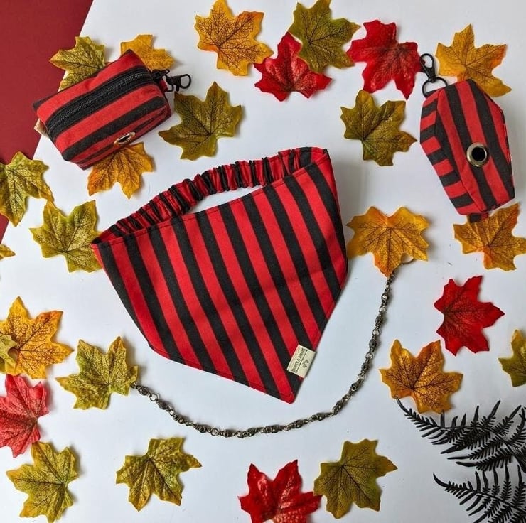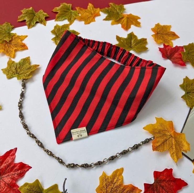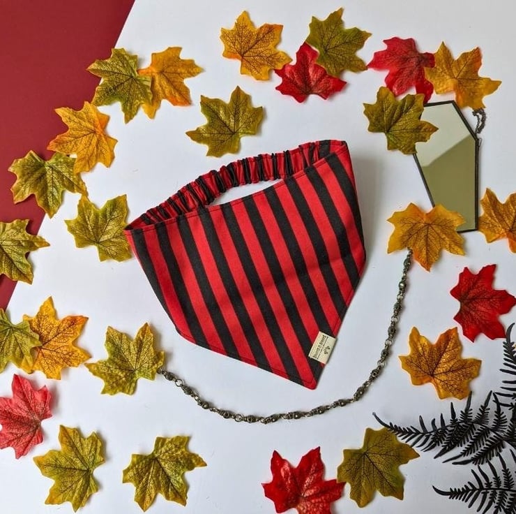 Lovingly handmade using salvaged poly-cotton in my small garden studio in Northamptonshire, this double-sided bandana is available in 5 sizes Tiny to XL - please see the photos for a handy size chart.