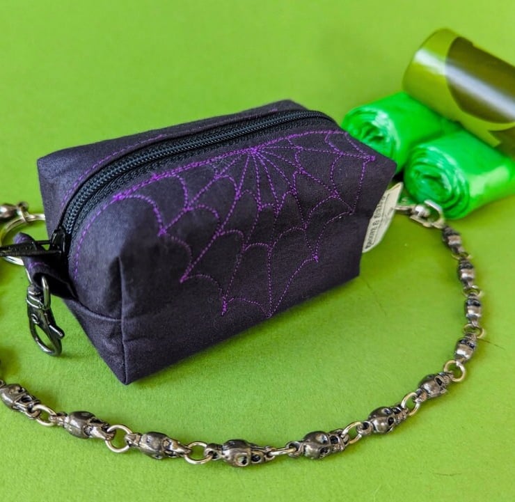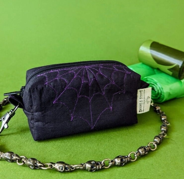 Lovingly handmade using salvaged poly-cotton finished with an embroidered spiderweb design, in my small garden studio in Northamptonshire, this deluxe bag measures 10 x 10 x 5cm