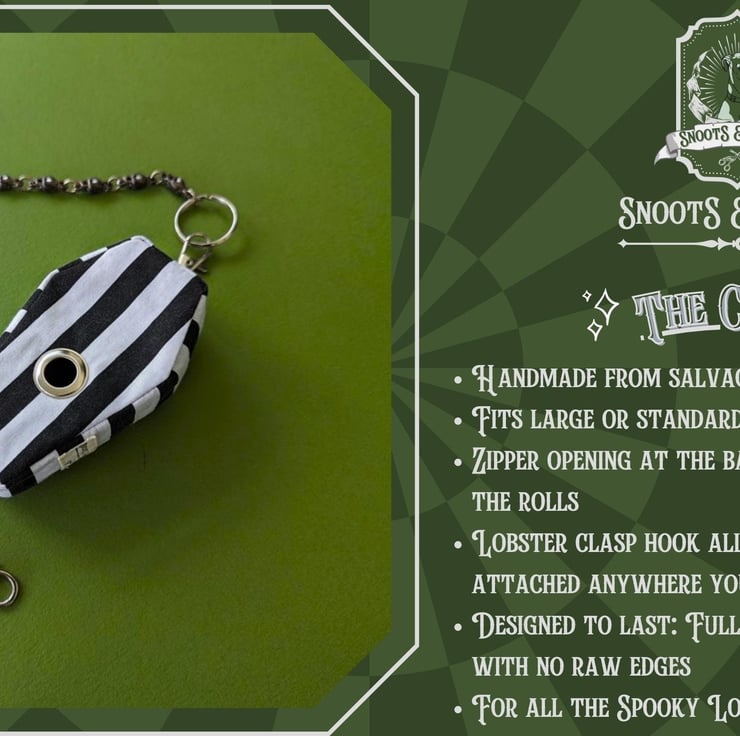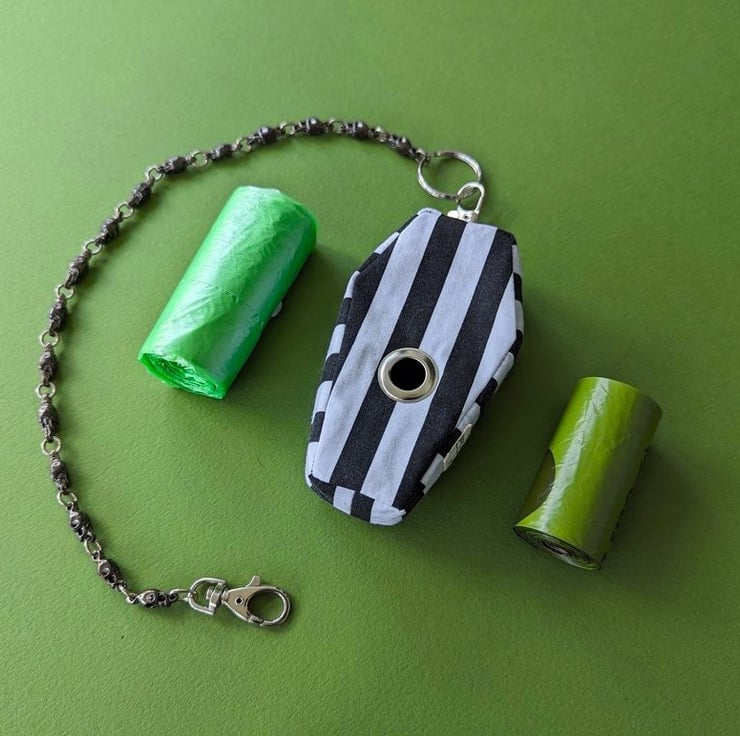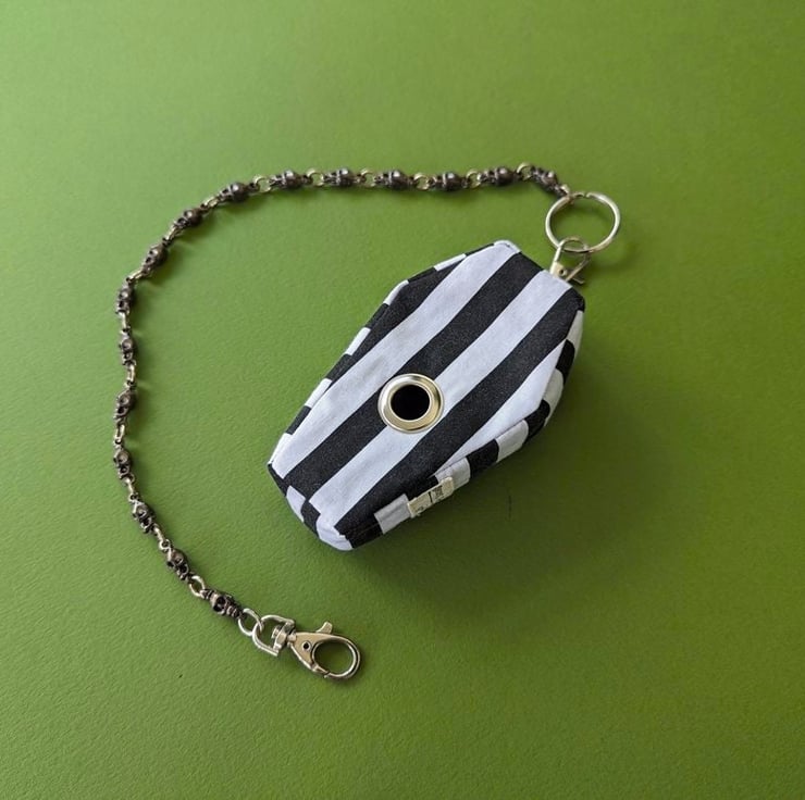 This Black and White Striped Coffin shaped Poo Bag Holder is deadly cute, and so useful you'll be even more scared to forget your waste bags for your walkies! Made with deadstock and salvaged fabric from landfill, vintage zippers and lots of added spooky vibes.
