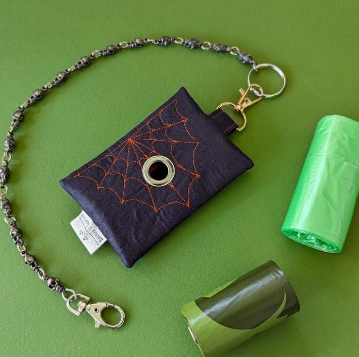 Lovingly handmade, using salvaged poly-cotton finished with an embroidered spiderweb design, in my small garden studio in Northamptonshire, flat poo bag holder measures 7 x 11cm