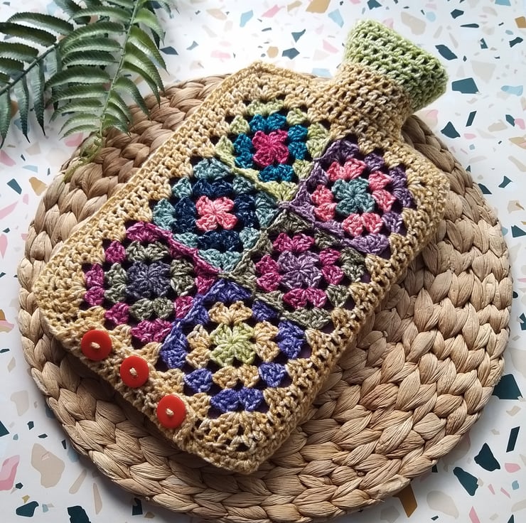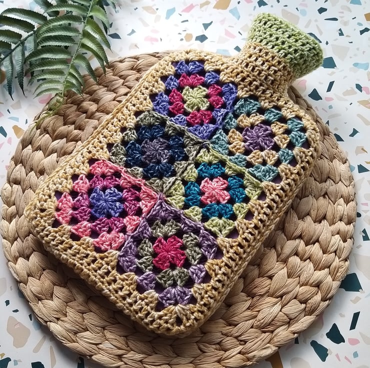 Made just like my 'Happy Scrappy' blankets using all my half balls and ‘ends’ of yarn from other projects minimising waste. Each granny square is different meaning that every cover will be different too, so your hot bottle cover will be unique to you!