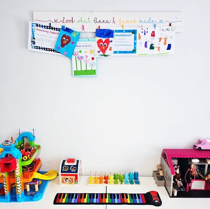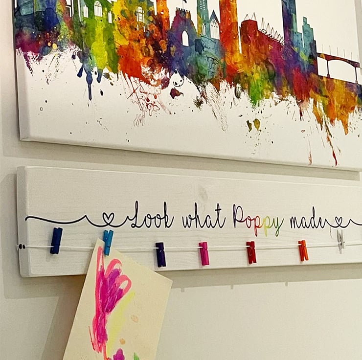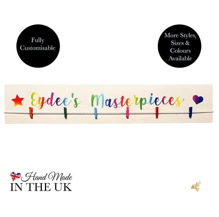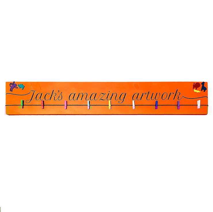 Designed with colorful pegs and string, it’s the perfect solution for showcasing your little one’s creations in any room. Each display is hand-cut from locally sourced, reclaimed wood and personalised just for you. The plaque is finished with permanent vinyl lettering and sealed with a non-toxic coating to ensure lasting durability.