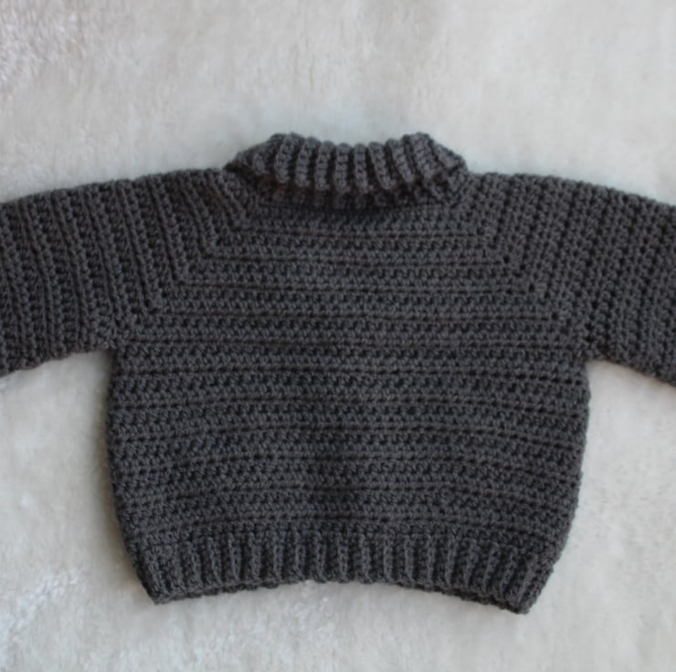 This baby cardigan is crocheted in a traditional style with a fold over collar that gives this cardigan a vintage and trendy feel.