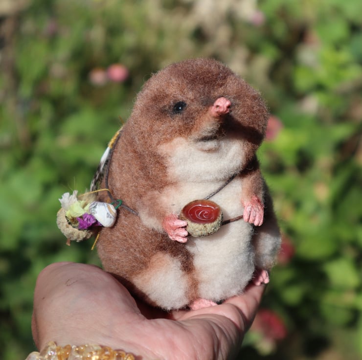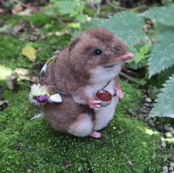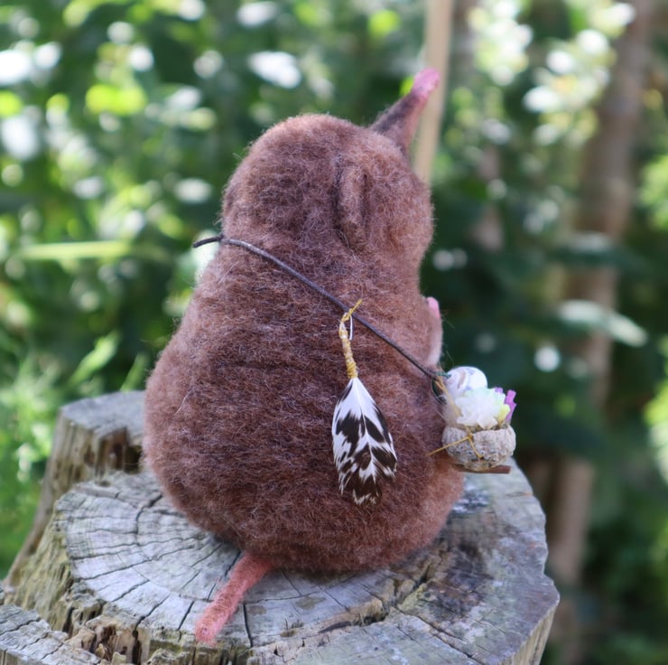 He has a waxed string strap adorned with his treasures, a feather, acorn cap of dried statice flowers and a little shell.