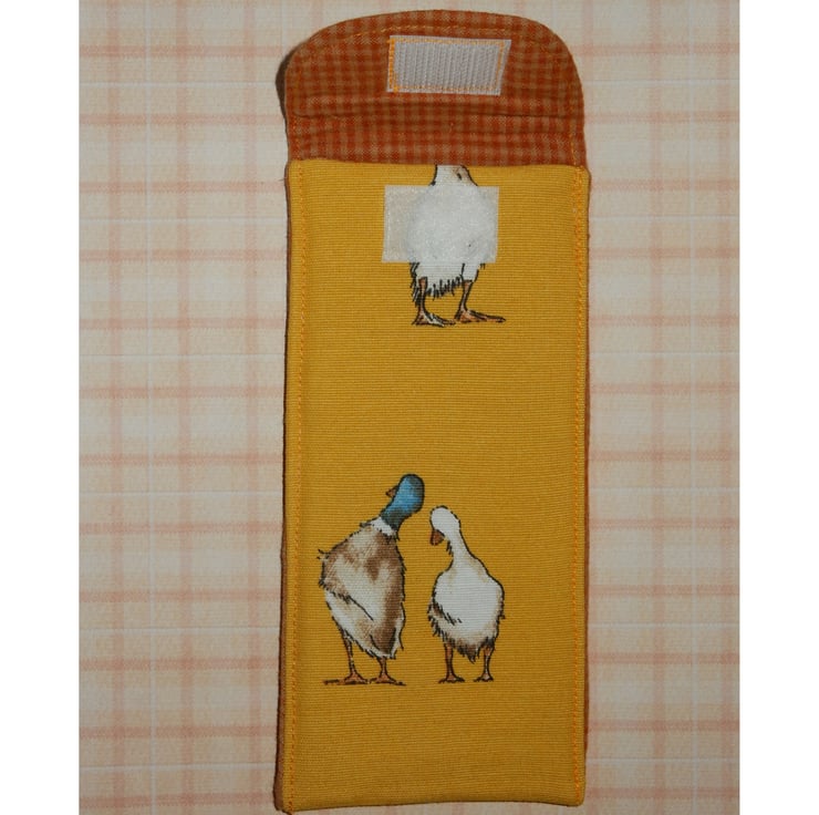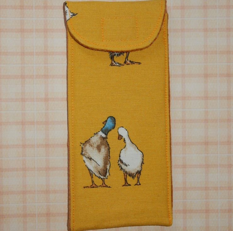 This glasses case is made from heavier weight cotton fabric, featuring cute ducks and geese on a mustard yellow background. It has a toning brushed cotton check lining, and a layer of wadding for protection. The case fastens with Velcro. A perfect gift for lovers of ducks and geese and is ideal for your glasses or sunglasses.