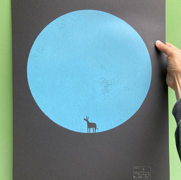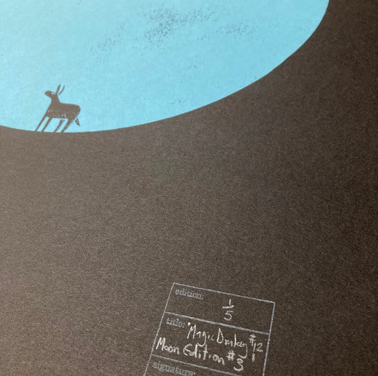 This is a hand-pulled screen print entitled 'Magic Donkey No.12, Moon Edition No.3' printed in light blue on black paper.