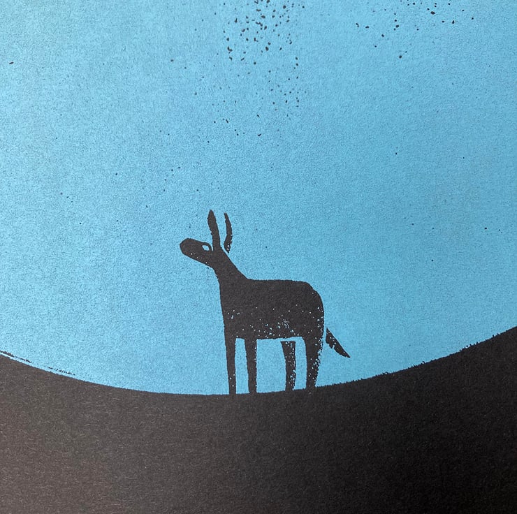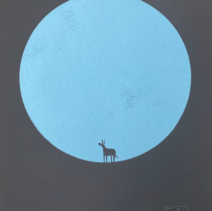 This is the twelfth print in the 'magic donkey' series, a continuation of my donkey dreamworld theme. I've always had a fascination with circles, using them in my prints regularly, and on this occasion it is the ultimate minimalist tribute! The donkey stands before a mighty circle. Is it a moon, a solid dot, a passage to another place? They will find out soon enough..