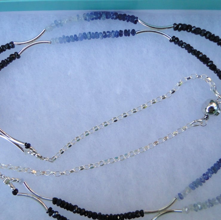 Sparkly blue sapphire gemstone necklace with sterling silver tubes and clasp