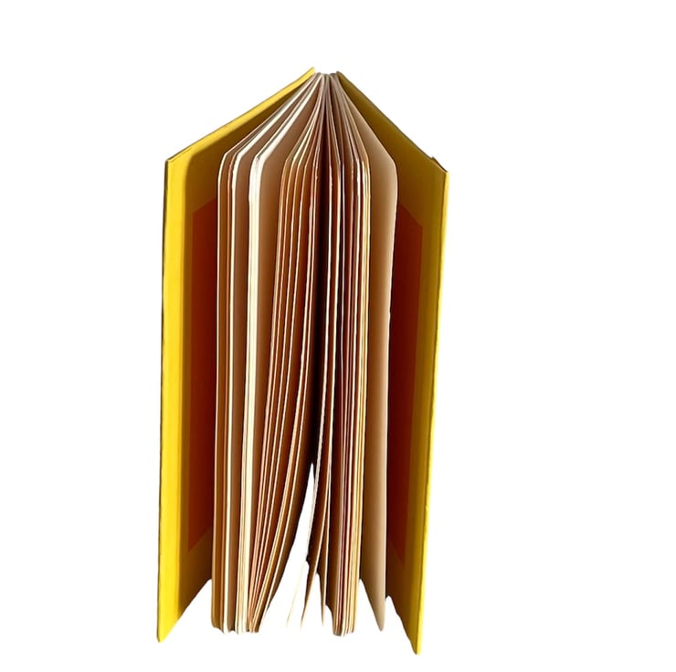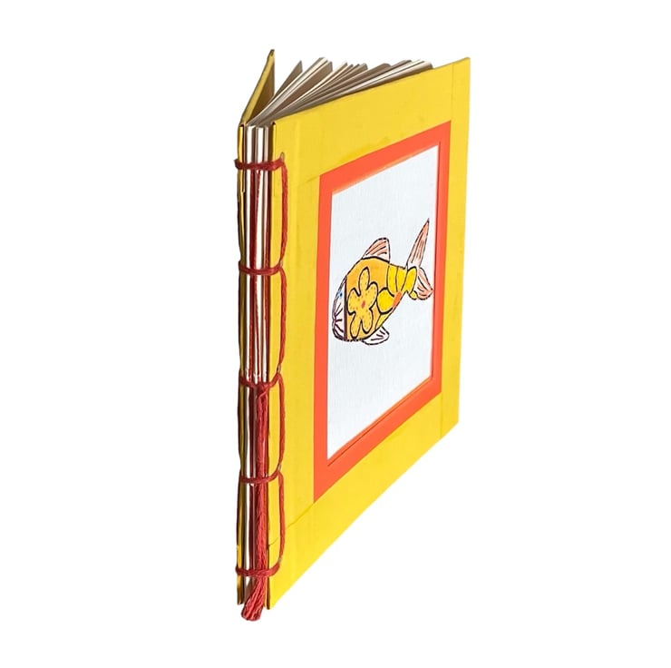 This notebook is hand constructed from a strong cardboard mount with a hand painted cover design. It contains three book blocks of premium writing paper which are hand stitched to the spine.