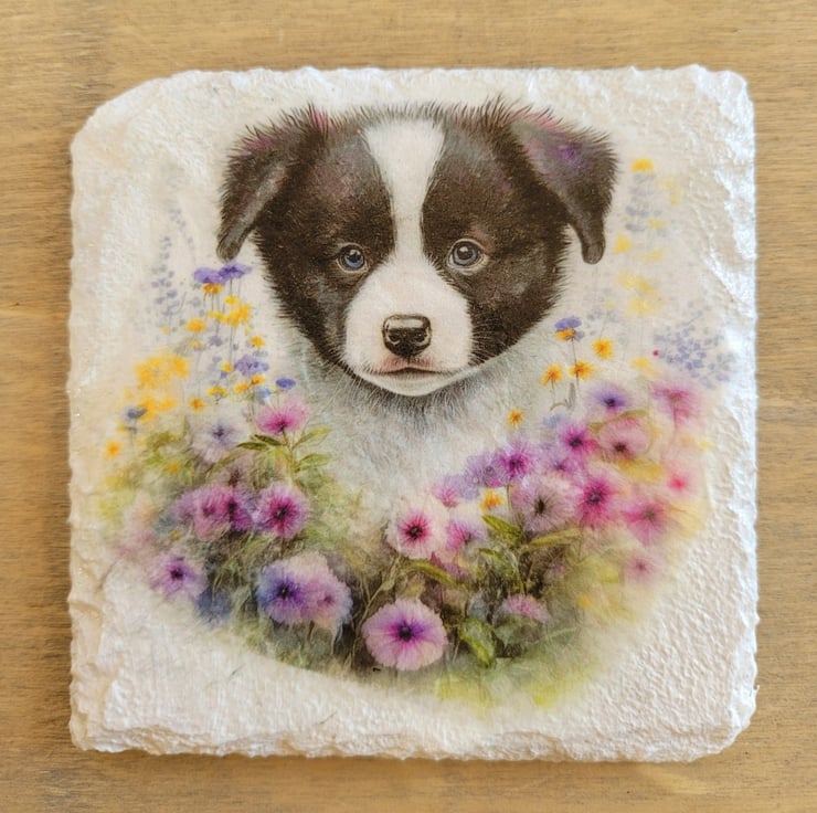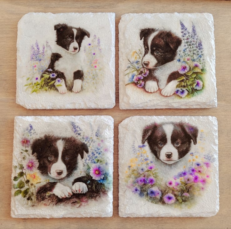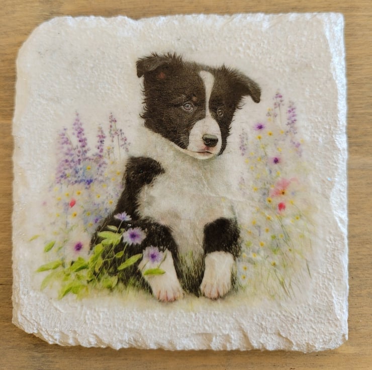 Introduce a splash of personality with our charming set of four Border Collie coasters, each boasting a unique design that captures the playful spirit of these adorable pups. Crafted from square slate, these coasters are not only cute and colourful but also incredibly practical for everyday use.