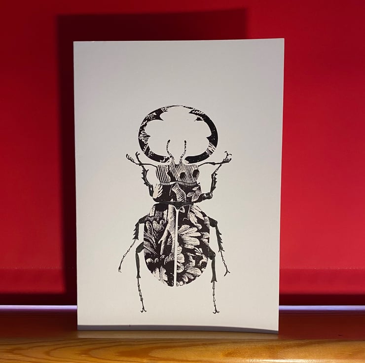Stylised black and white Stag design in abstract wood block print reminiscent of Eric Ravilious artworks. A5 high white 300gsm recycled pulp board in matching envelope. Left blank for your own message. Price reduction on ordering two or more.
