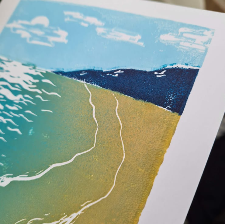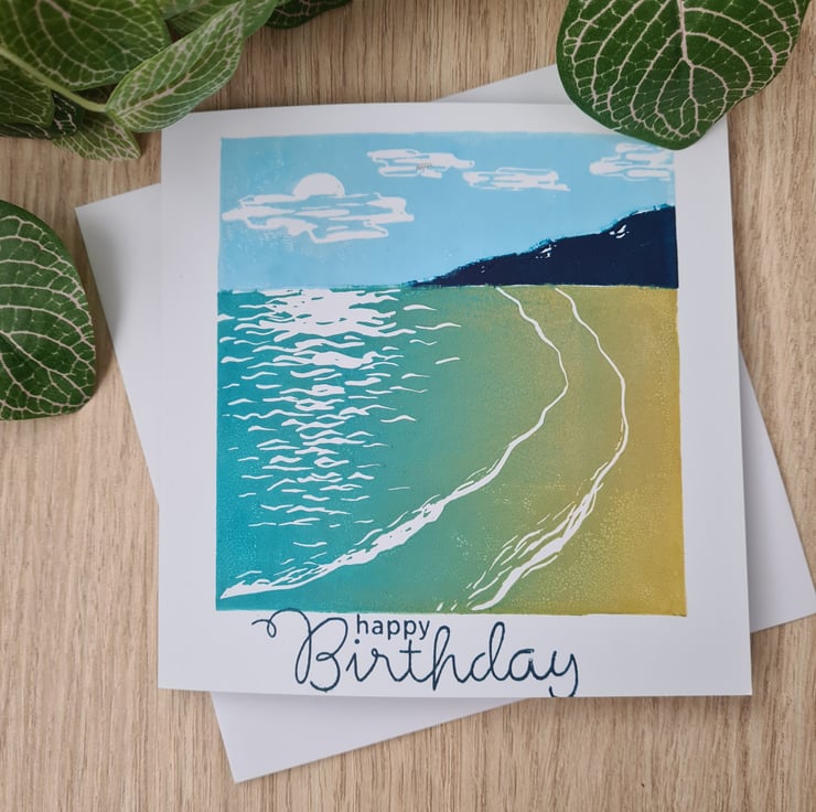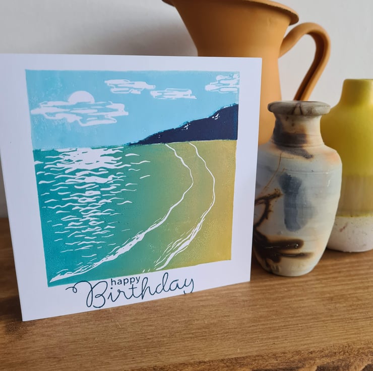 This handprinted beach scene, coastal art card is from a linocut that I have designed and carved myself. It's a 'jigsaw print' as I cut it into three pieces and inked them separately to make the different colours and put them together again to print. This is more complex than normal but the result is lovely colours which can be easily changed. This design is available separately as a Father's Day card, or you can purchase it using the option 'no text' if you want to frame it.