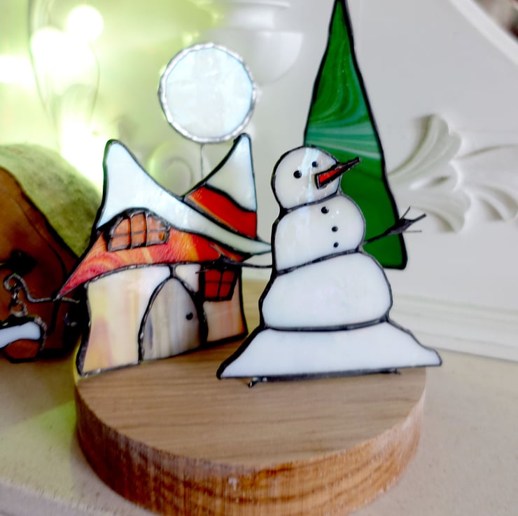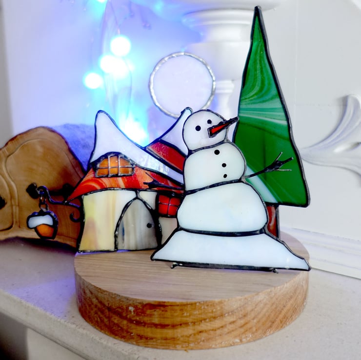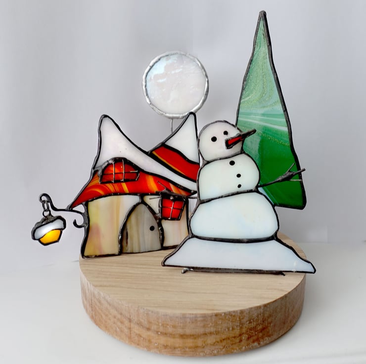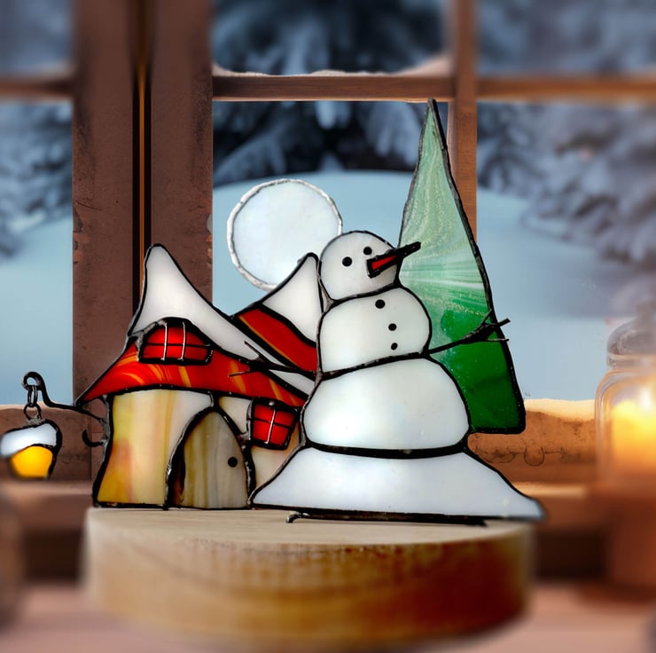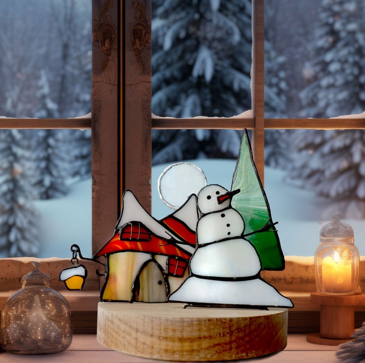 Unique stained glass suncatcher tealight holder ornament with snowman, cute cottage, fir tree and full moon.
