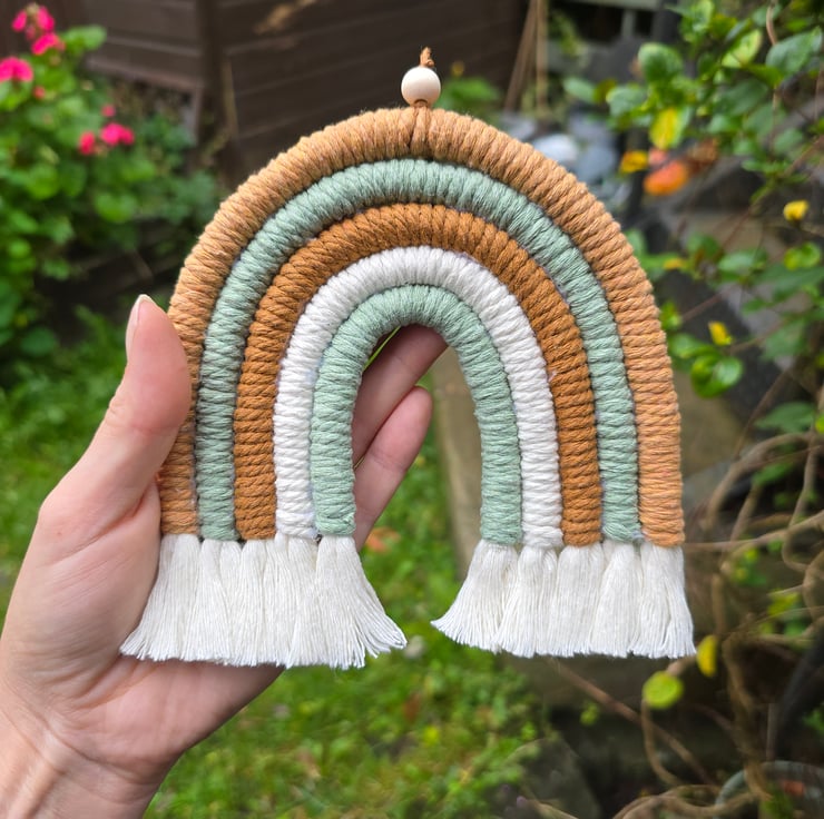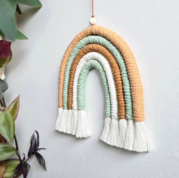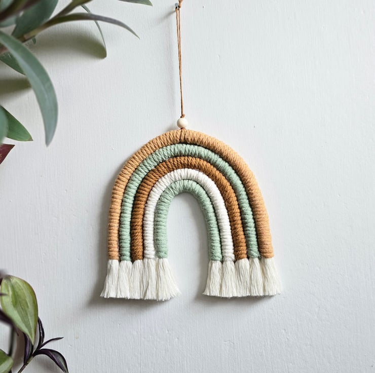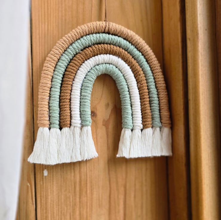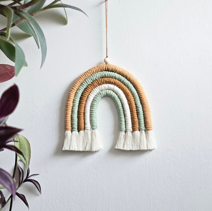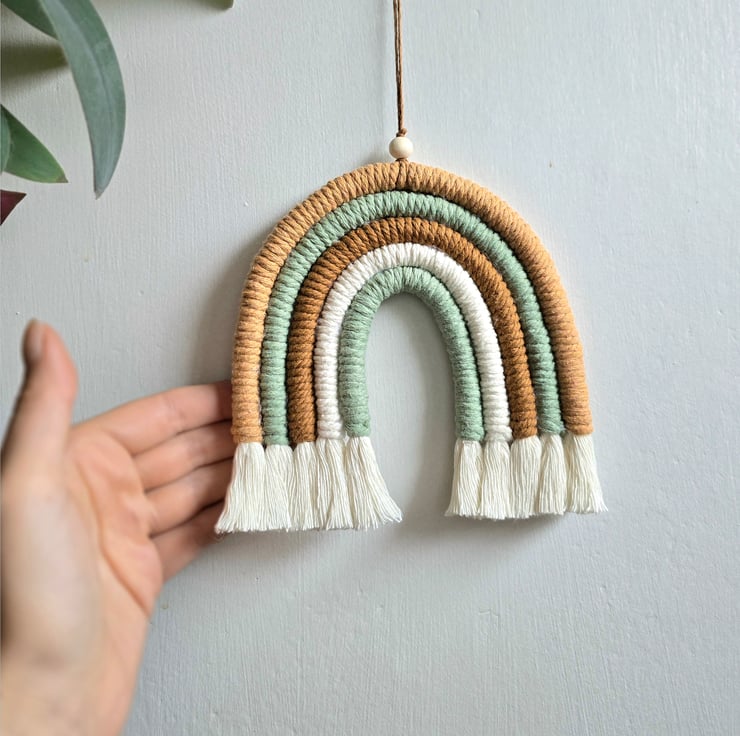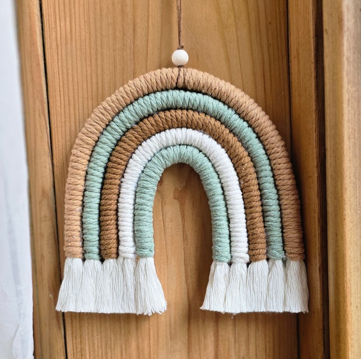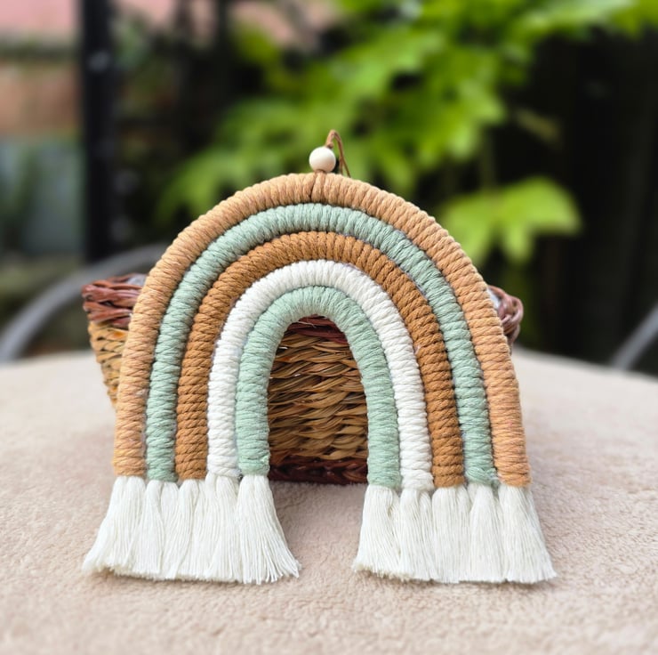 Rainbow macrame wall hanging in tones of greens and beige. Bring a modern macrame touch to any room in your home.