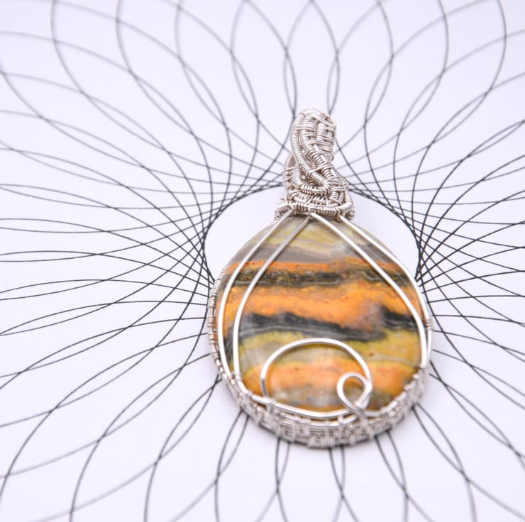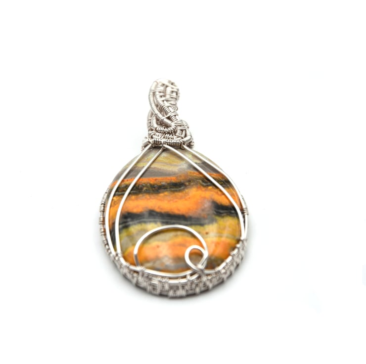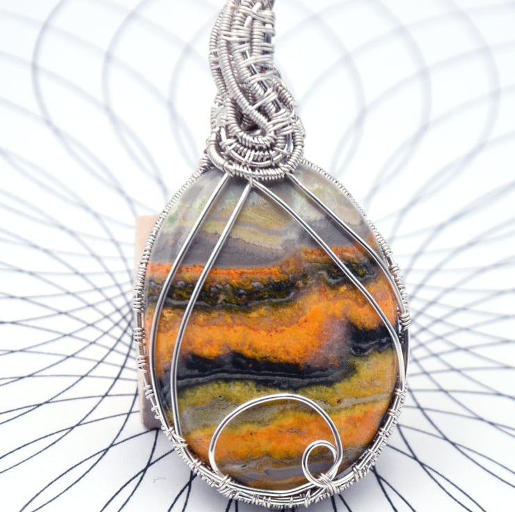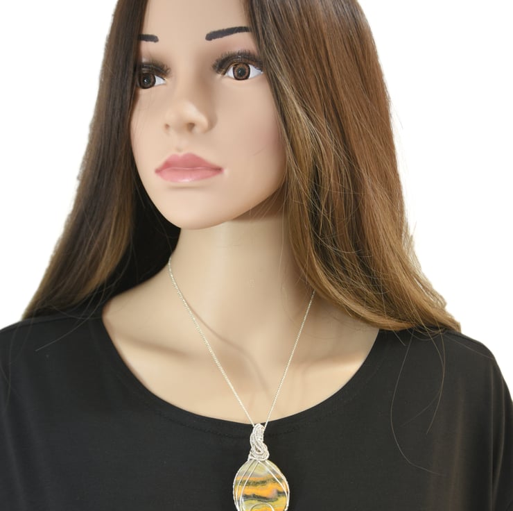This unique pendant has at the center a beautiful 94 cts jasper stone (dimensions: 45x34x7 mm). The wire wrapping setting off the beauty of the stone is made using tarnish resistant silver plated copper wire.