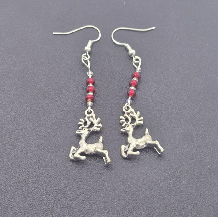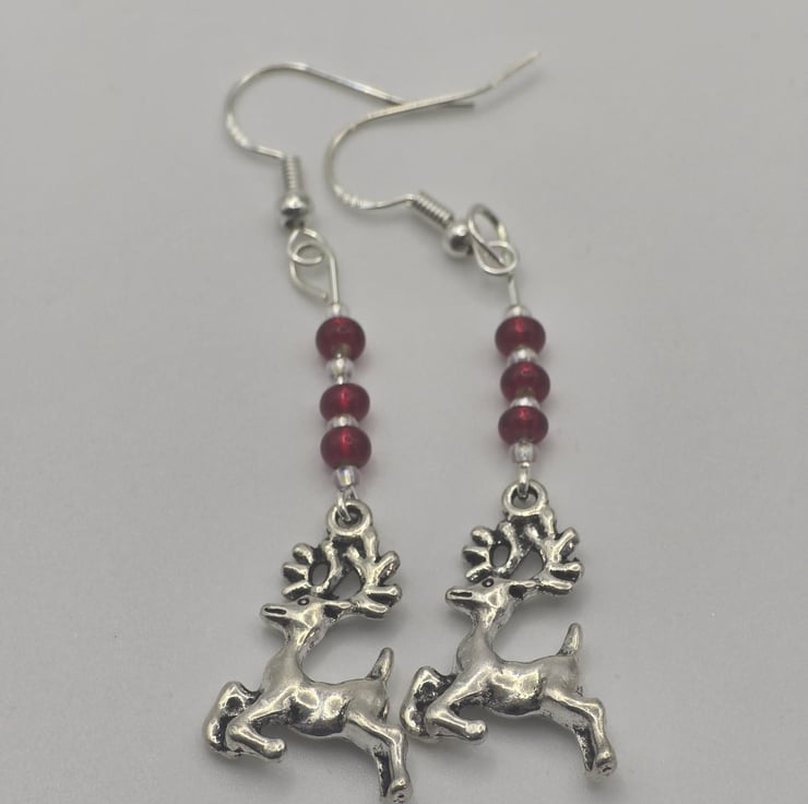 The earrings have been made using using Large red seed beads with smaller clear crystal seed beads with a silver Reindeer charm on the end - The hooks are sterling silver and hypoallergenic, they come with rubber backs so they dont fall out of your ears.