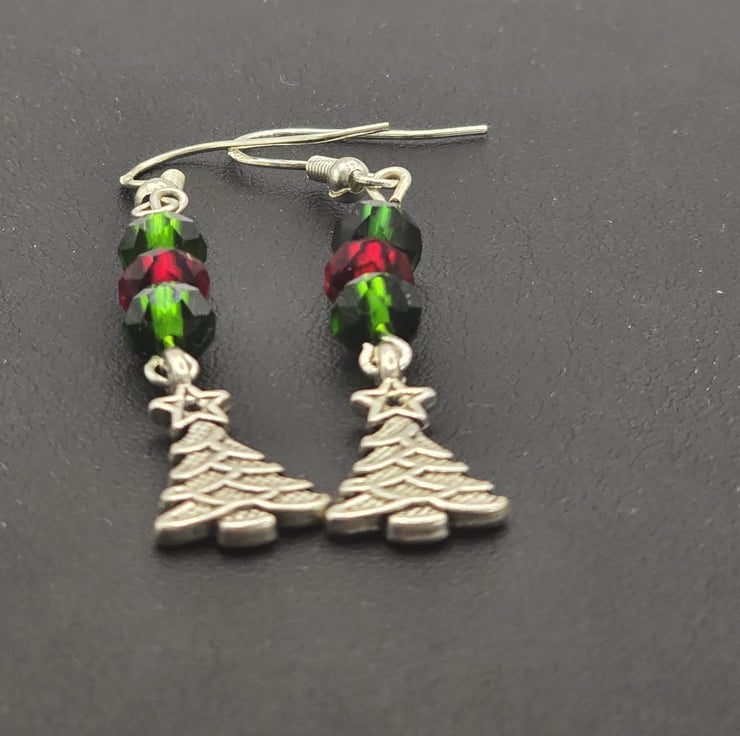 The Christmas tree earrings have been made using Green and Red faceted glass beads and a silver Christmas tree charm at the bottom of the earrings. The hooks are sterling silver and hyppoallergenic, they come with plastic backs so they dont fall out of your ears.
