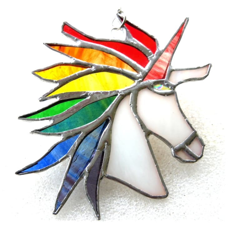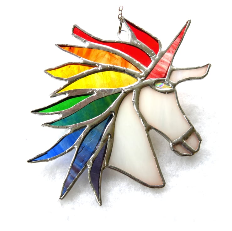 The unicorn hangs from a silver chain which is securely attached to the top by a soldered wire ring.