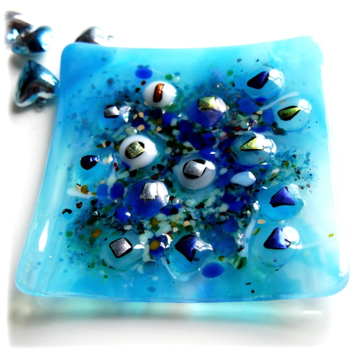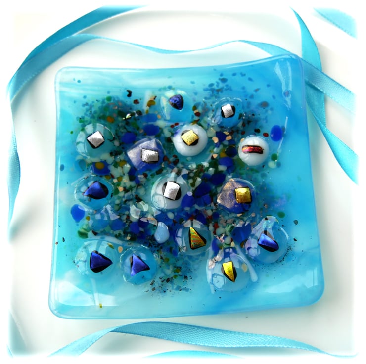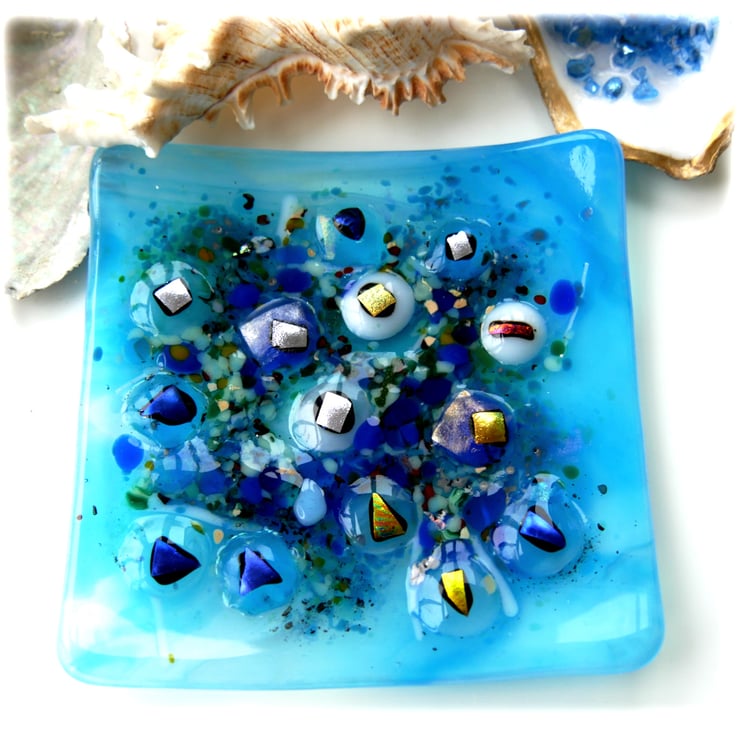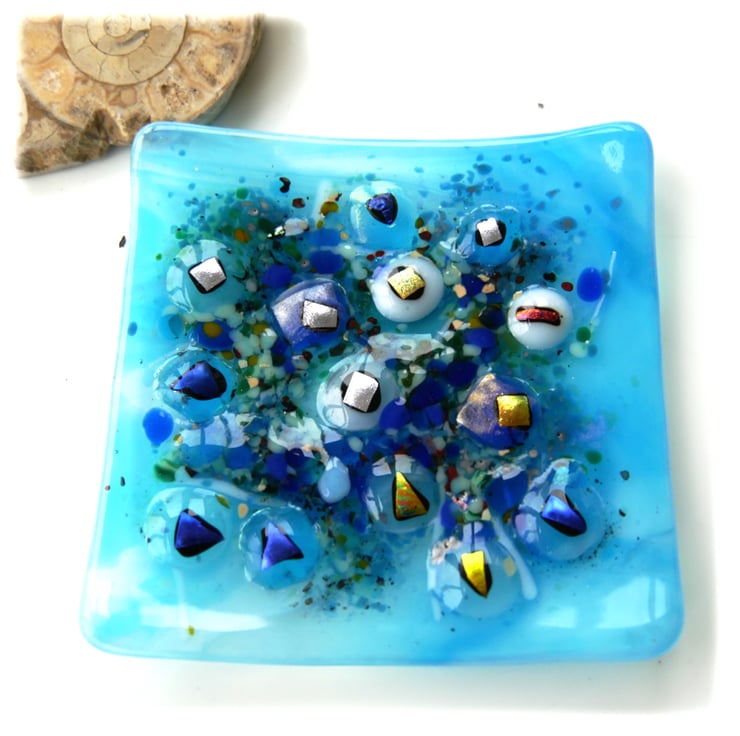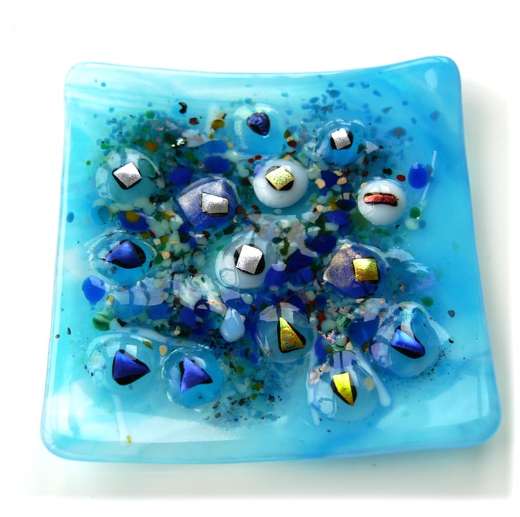 I made this with a base of gorgeous streaky turqoise glass and then added a top layer of sea coloured frit and little dichroic glass topped nuggets I also fused in the kiln.