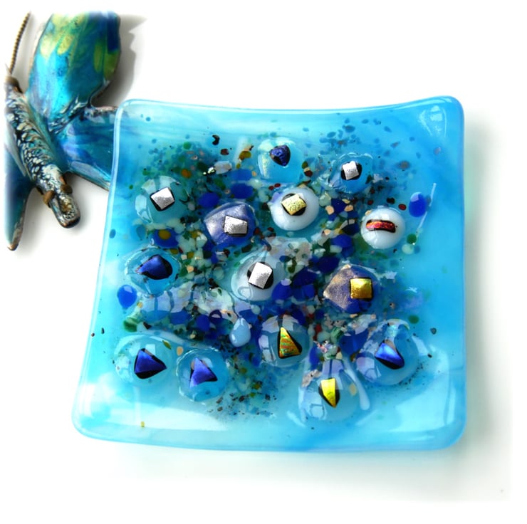 An 10.5 cm shallow square dish which I fused in my kiln. Twice, once to fuse all the glass together into a flat square and then again, to slump it into the shallow dish shape.