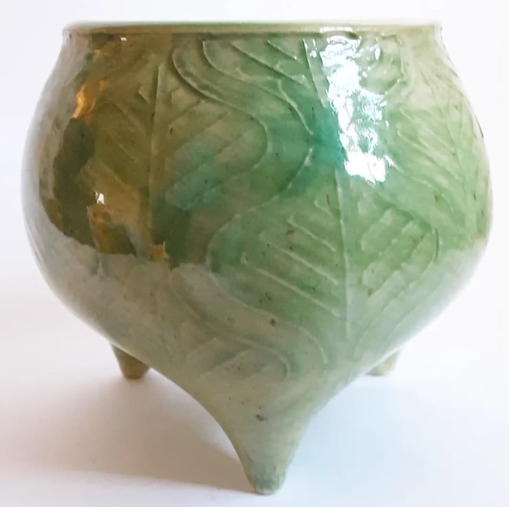 Glazed in blue glaze on the outside and black on the rim. It has a pattern around the outside