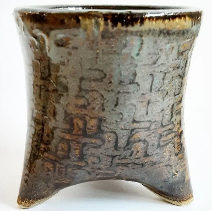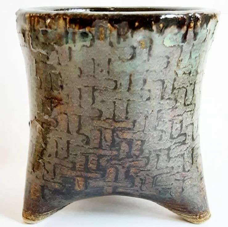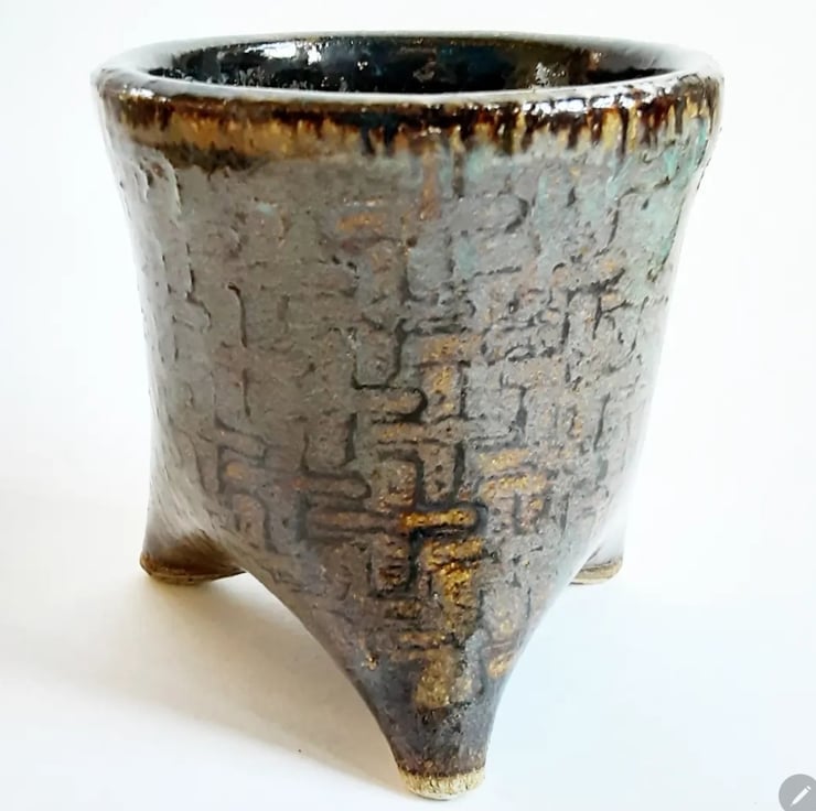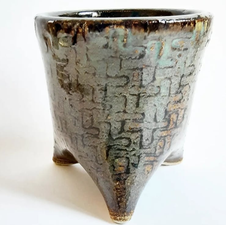 Glazed in green and brown glaze on the outside and brown on the inside. It has a pattern around the outside