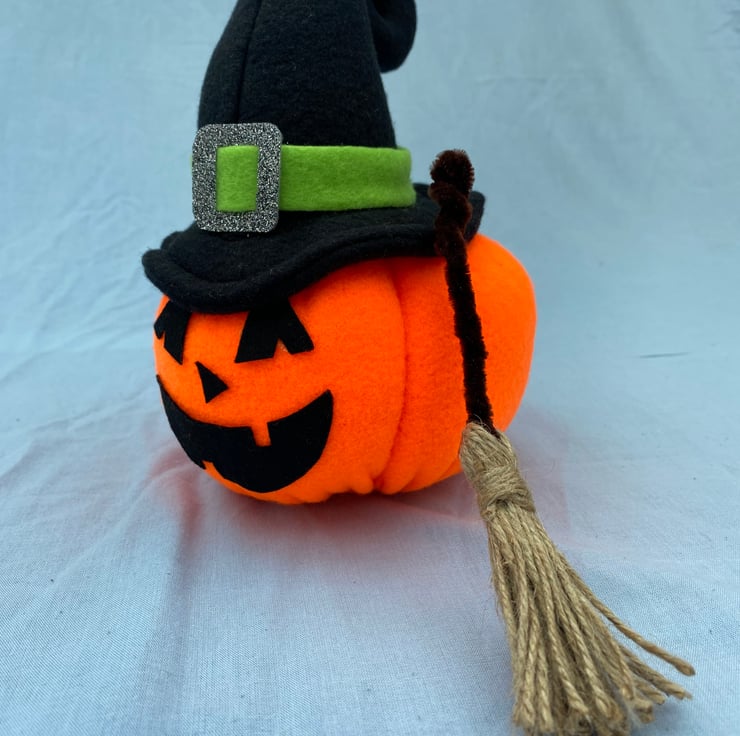 These pumpkins won’t need to be turned into pumpkin soup ! In a very bright Orange fleece these pumpkins will stand out in a Halloween display in your home. Both have a broomstick for added effect.