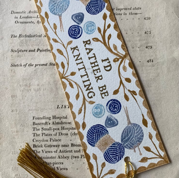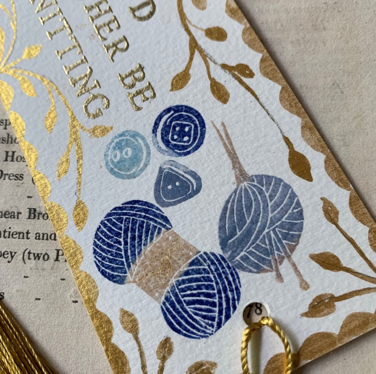 It's a sentiment with which many knitters would always agree! This pretty bookmark is perfect for the knitter in your life. Hand painted and embossed in tones of antique gold and blue it is a very pretty bookmark indeed The bookmark doubles as a greetings card and is much more useful! The reverse is left plain for your own message. This is one greeting that will not be thrown away or saved forever in a drawer.