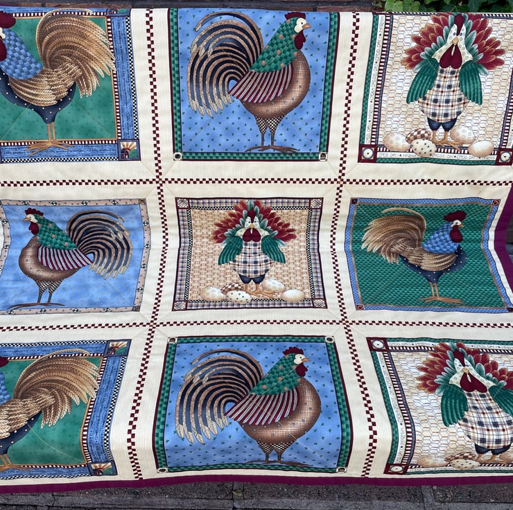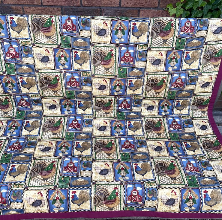 Beautiful quilt with lovely images of hens and cockerels designed by Debbie Mumm. Makes a lovely little lap quilt, sofa throw or picnic rug. In rich autumn colours it is made from high quality quilting fabric 100% cotton. Backed with coordinating fabric also featuring hens and cockerels and bound in maroon fabric. wadding is 50/50 cotton bamboo blend. Size approximately 44 x 44ins.