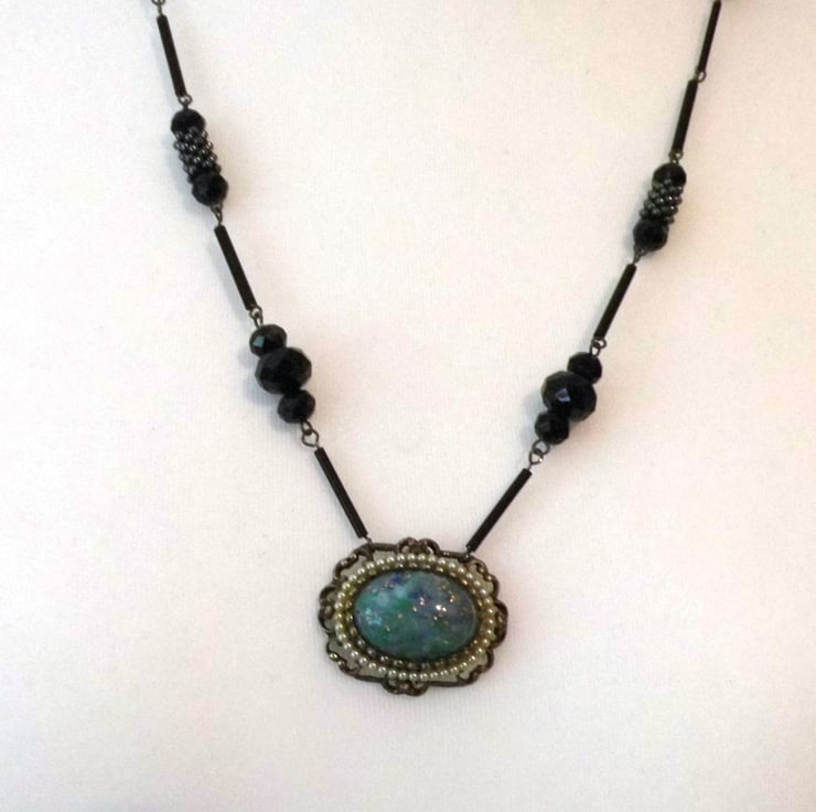 A turquoise blue and green marbled glass cabochon with gold flecks is surrounded my small faux pearl beads. The chain is an art deco style black glass bead chain. Black long tube beads, multi faceted beads, black beads and silvertone metal segments form sections on wire. These sections are then connected to make a long necklace and attached to the blue marbled pendant.