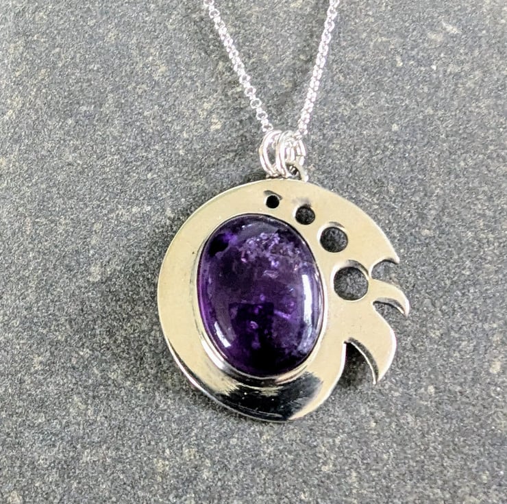 A lovely deep purple amethyst set on a sculpted and polished sterling silver backplate. A neat little pendant on a sterling silver chain. Overall measurement of silver back plat is 28mm.