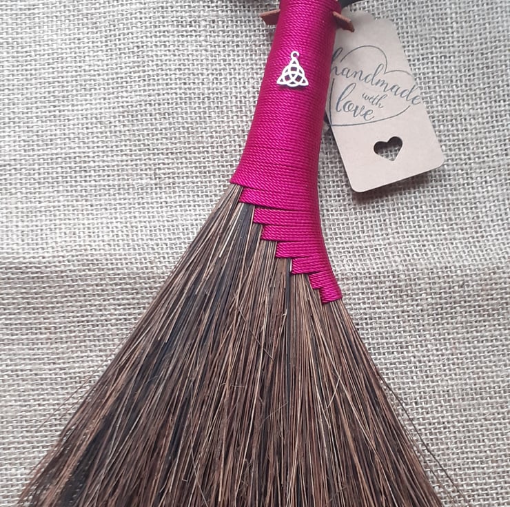 This brush is approx. 32cm long, made with Palmyra fibre, a strong stiff long lasting fibre from the leaf sheath of the Palmyra palm. This brush comes with a pink cord handle, Celtic Knot charm and leather strap for hanging.