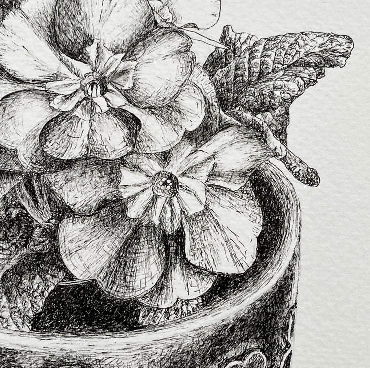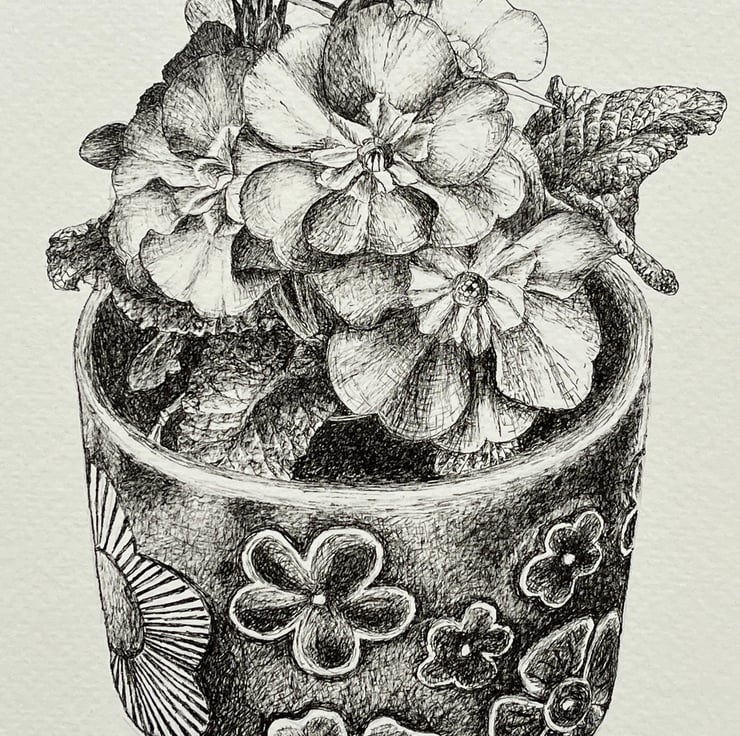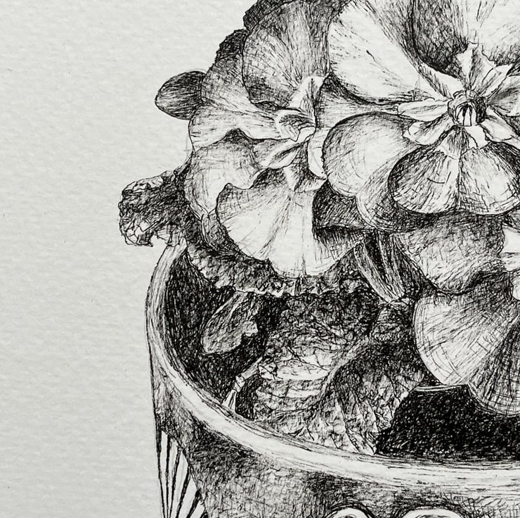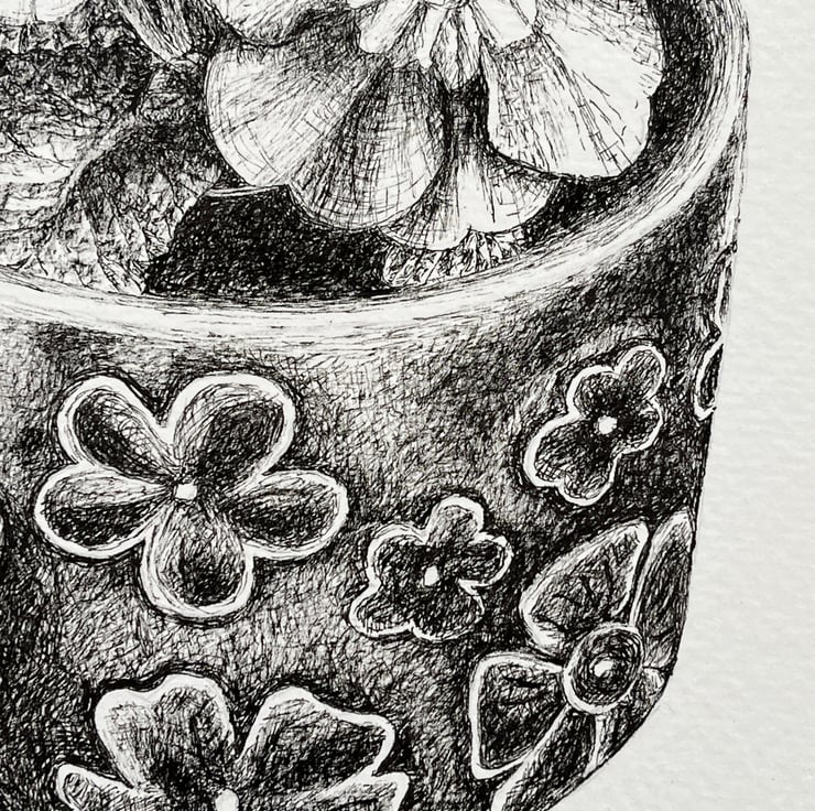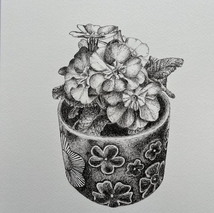 An ink drawing of a potted plant onto 300gsm acid free watercolour paper. The paper measures 21cm by 29.5cm (A4) and the image measures approximately 16.5cm by 12cm. An original drawing not a print and would make an ideal gift for someone. The drawing will be sent inside a board back envelope.